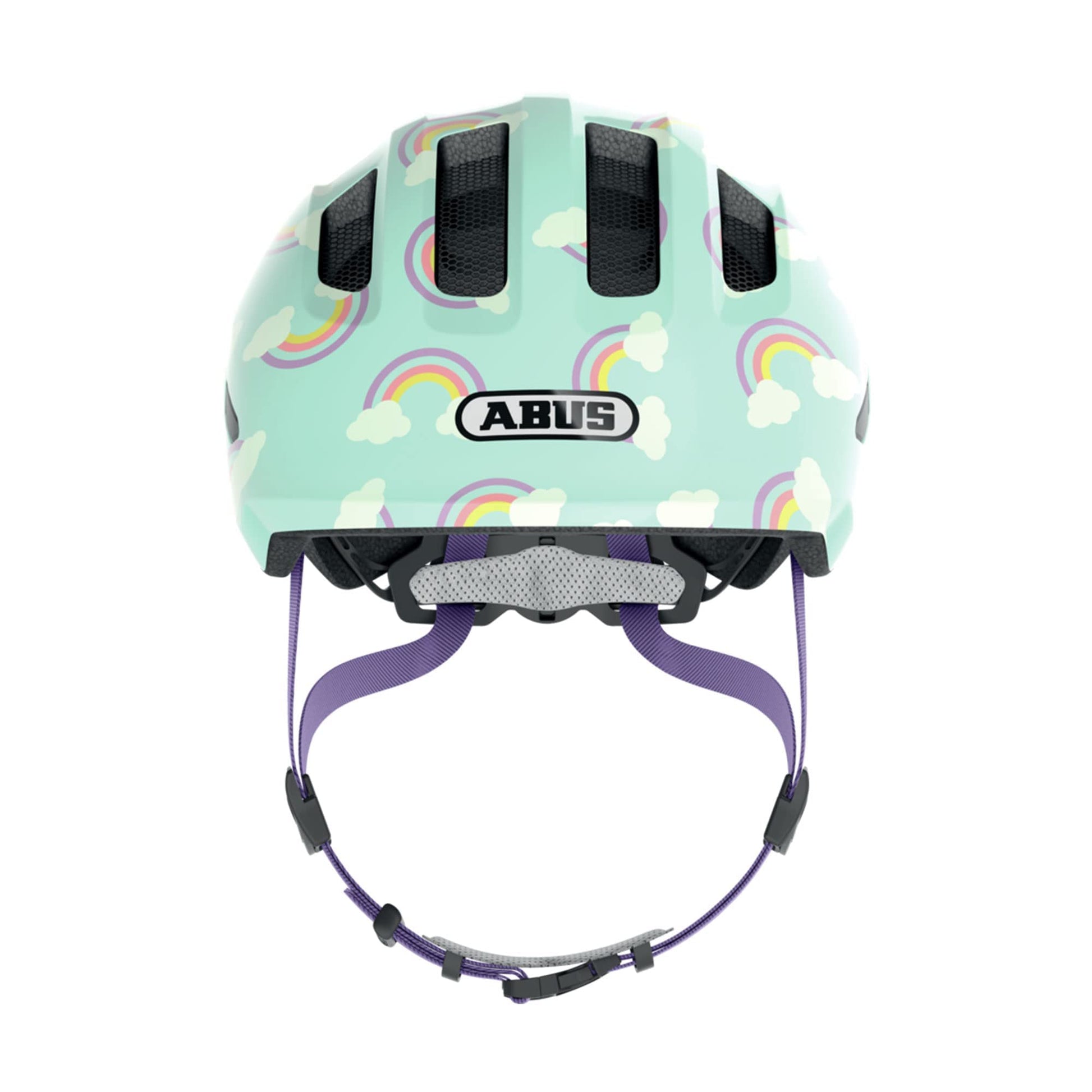 ABUS Children's Helmet Smiley 3.0 LED - bike helmet with light - deep fit & space for a ponytail - for girls and boys - Light blue with rainbow pattern, size M