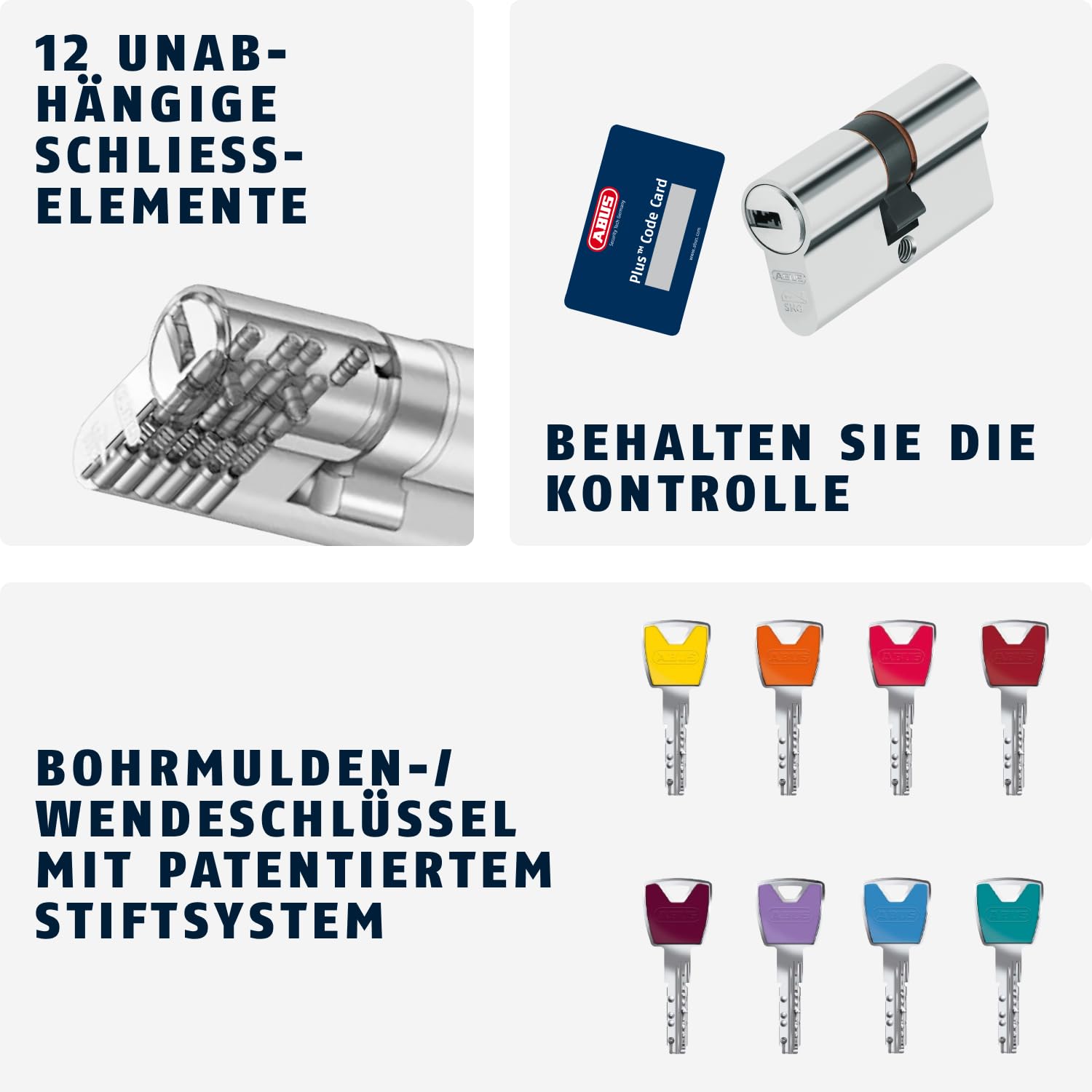 ["Cylinders and spare keys can only be produced with the presentation of the security card","Emergency and hazard function (lockable on both sides, even if the key is inserted on the inside)","Anti-bump technology (pat.): Highest resistance to bumping through innovative pin-in-pin technology","Mortise key with patented pin system in the key tip","High-quality locking system with 12 independent locking elements in 3 pin levels"]