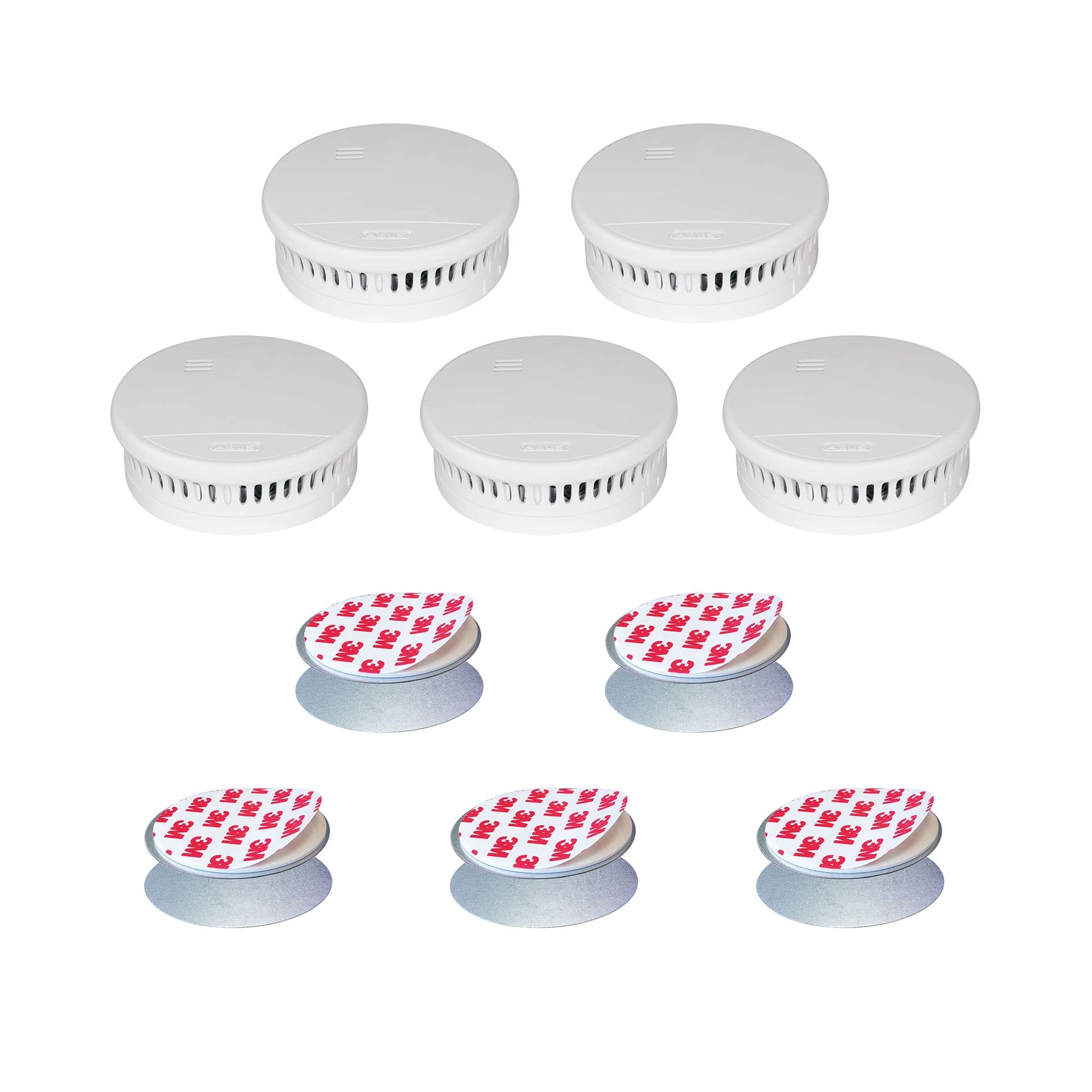 ["LIFESAVER: The alarm sound (85 dB) activates when too many visible smoke particles enter the detector's measuring chamber - optical smoke alarm for a safe home","10 YEAR BATTERY: constant functionality thanks to long-life battery - 10 year 3 V lithium battery is pre-installed | Low battery warning sound","CERTIFIED: excellent smoke detector certified by VdS - tested according to EN 14604 standard and VdS guideline 3131","PRODUCT DETAILS: 5 x smoke detectors + 5 x magnetic brackets - Diameter 10 cm, Height 3.6 cm, Weight 200 g, LED light flashes every few minutes, Color Pure White","AWARD WINNER: awarded by Stiftung Warentest with a score of 1.9 in the 01/2021 edition","TEST BUTTON: Test button for manual self-test and to silence false alarms | 9 minutes silent, then reactivation","USAGE: ideal for ceiling installation in rooms up to 40 m²: best in bedroom, nursery, living room, hallway, caravan or motorhome"]