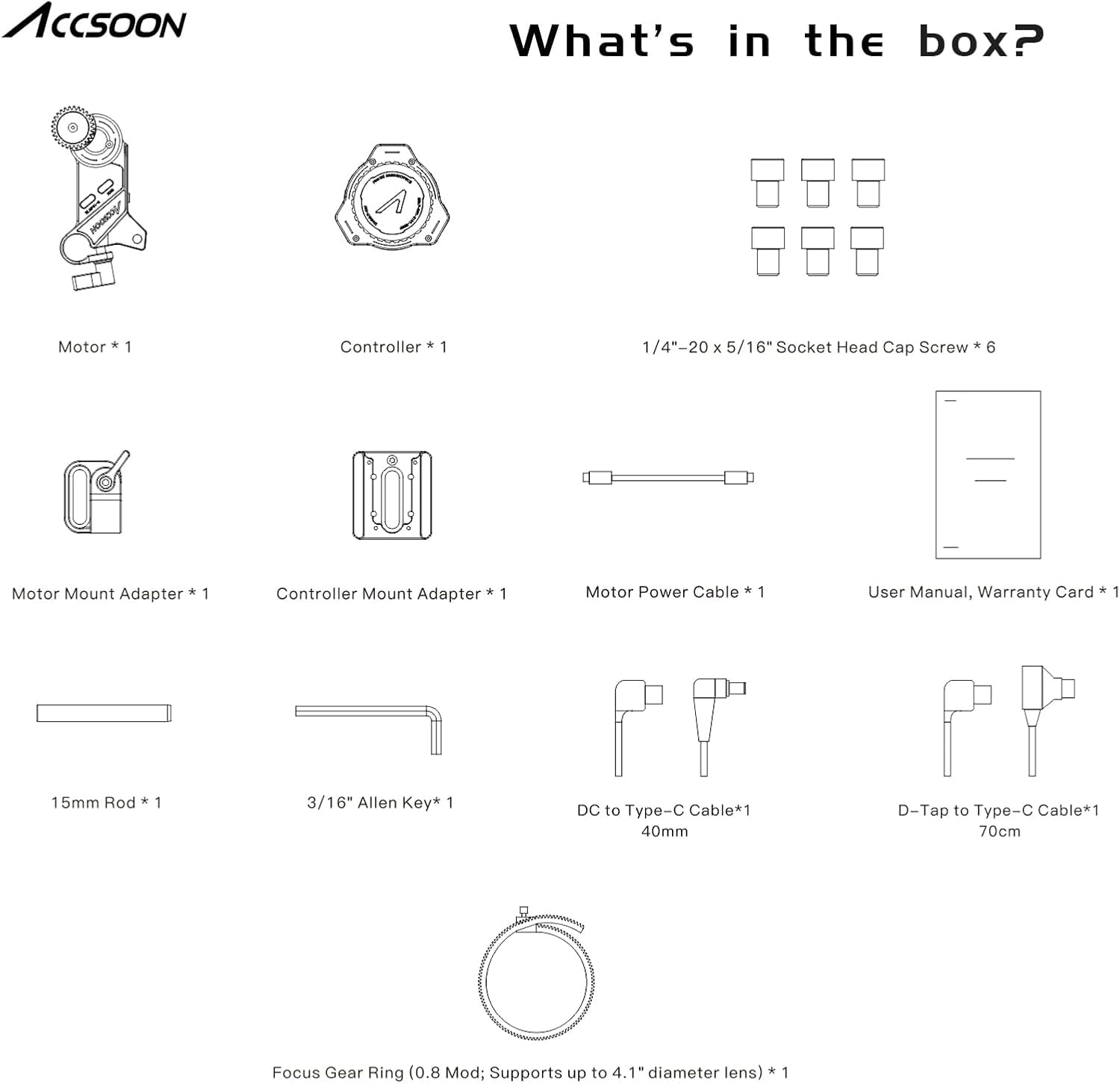 ["【Anti-Interference FHSS Technology】Accsoon F-C01 is equipped with FHSS* technology, which allows for modulating the frequency between the motor and the focus knob. This avoids interference from signals generated by other devices on set, providing the user with a reliable connection. FHSS allows for the use of multiple device pairs on set when shooting with multiple cameras.","【A/B Quick Focus Point Setting】Accsoon F-C01 features an A/B quick focus point that allows you to adjust the appropriate A/B focal length according to your shooting requirements, enabling quick and stable focusing and giving you more control over your camera and lens.","【Automatic and Manual Lens Calibration】Accsoon F-C01 needs to be calibrated before use. There are two calibration options available. For camera lenses with a mechanical limit, you can use the automatic calibration function; otherwise, use the manual calibration function. Certain operations are performed on the controller.","【0.01s Quick Response】The almost real-time response between the motor and controller, along with the high torque of 0.35 N-m, offers 1st ACs and focus pullers a smooth and reliable focusing experience.","【350ft/100m Control Range&Quality Assurance】The Accsoon F-C01 also boasts an impressive 350ft control range (100m), allowing the camera to be placed in tight situations and the crew to be in a comfortable position to wirelessly pull focus. Accsoon provides high-quality products and values customers' shopping experience. Worry-Free 12-month warranty, 12-hour friendly customer service."]