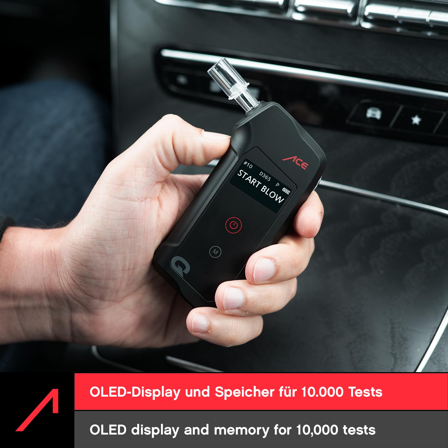ACE Q Alcohol Tester - Breathalyzer with memory and OLED display - police-calibrated accuracy - Alcohol tester for car and parties.