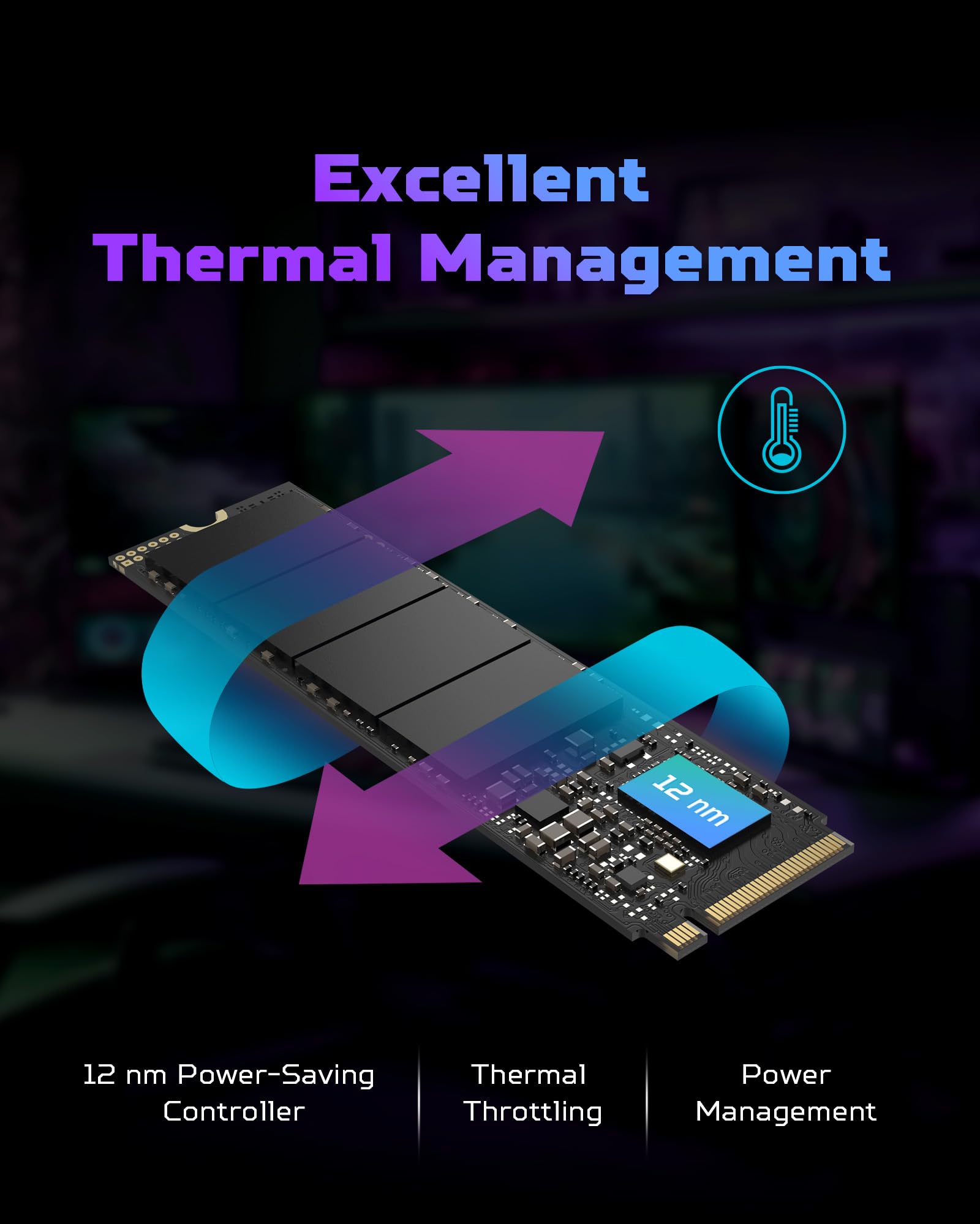 ["⚡ Highest speed thanks to PCIe 4.0: NVMe 2.0 ultra-fast read performance of up to 7400 MB/s and 6500 MB/s write - Perfect for seamless 4K gaming, video editing, and data transfer.","🔒 Premium reliability: Selected 3D TLC NAND chips + SLC caching technology for long-term stability and 1.5 million hours MTBF. Available in larger capacities with high-quality NAND for extended lifespan to meet diverse storage needs.","🔧 Advanced technology: NVMe 2.0 interface in compact M.2 2280 format, backward compatible with PCIe 3.0 systems. Equipped with the latest PCIe controller and NAND flash, offers high performance with lower power consumption and reduced heat generation.","💾 Temperature control: Integrated thermal throttling and power management for automatic temperature regulation, preventing temperature issues during intense workloads.","🎮 Officially PS5 compatible: Expand your console's storage* (*Note minimum requirements) + optimized for Windows/Linux PCs and laptops. Store over 50 AAA games, 4K movies, or extensive projects - No more need to delete!"]