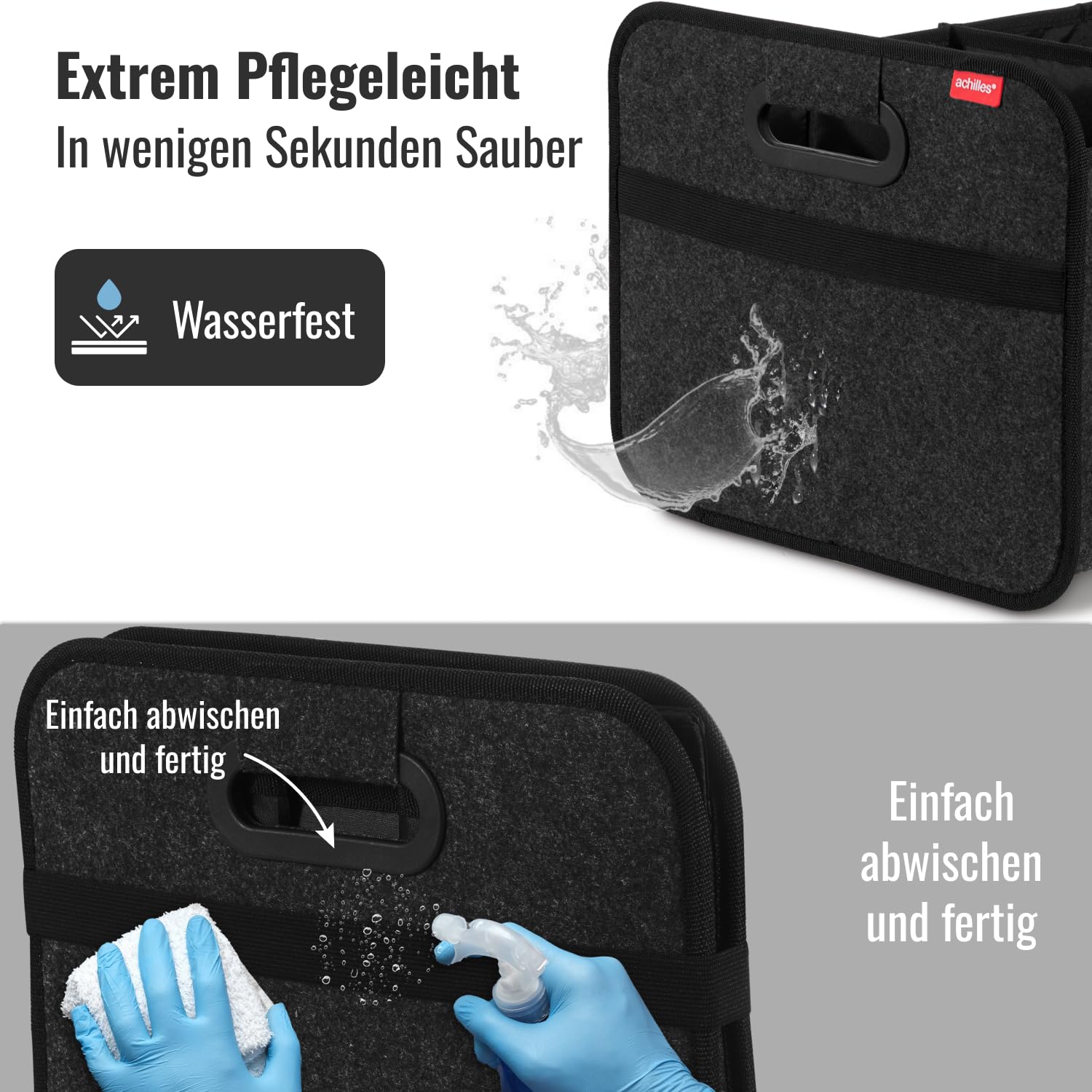 ["Spacious trunk bag: With a size of 50 cm x 32 cm x 27 cm, the large car bag offers plenty of space for all kinds of items such as groceries, sports equipment, camping gear, pet accessories, and more.","Foldable design: The car trunk bag made of felt can be easily folded and compactly stored when not in use. Inside the car box, there is a mesh pocket that also holds smaller items together!","Sturdy construction: The durable construction made of high-quality material ensures long-lasting durability and prevents the collapse of the transport bag, even when it is not fully filled. The shopping bag is ideal for daily use and long car trips.","Versatile use: The achilles car trunk box can be used as an organizer, shopping bag, car bag, or general-purpose transport box. It is ideal for use in cars, SUVs, vans, and other vehicles.","Easy to clean: The dirt-repellent surface of the felt trunk organizer allows for easy cleaning and maintenance. Stains and dirt can be easily wiped off with a damp cloth to keep the transport bag clean and hygienic."]