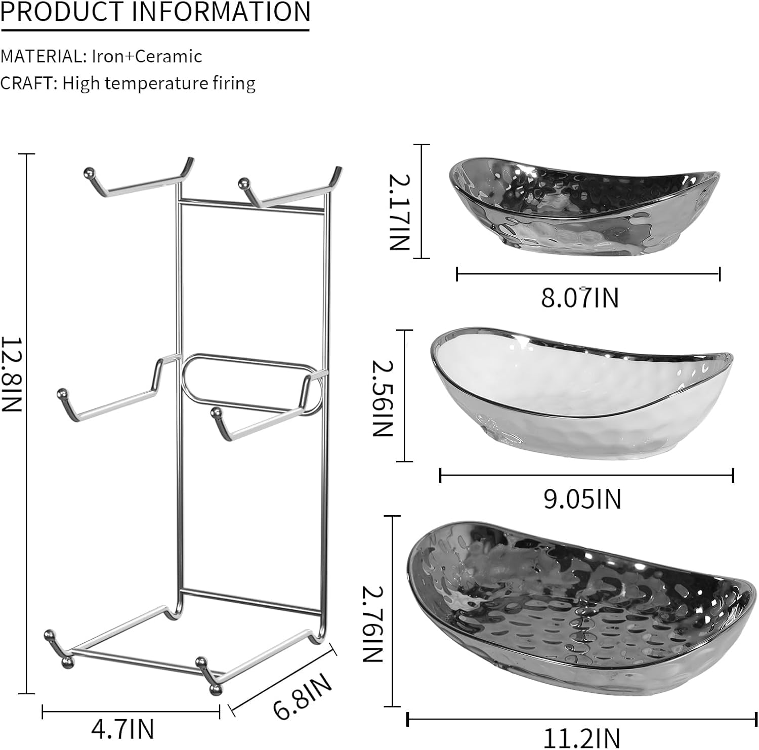 Sturdy and durable: Each serving bowl is made of high-quality ceramic with a smooth touch, the original color of the materials will not fade or rust. The shelf is made of metal, light and beautiful. The edges of the serving bowl are made of irregular lines, round and smooth, without burrs. The anti-slip ball on the bottom of the shelf has been polished smooth, prevents shaking and does not harm the countertop.