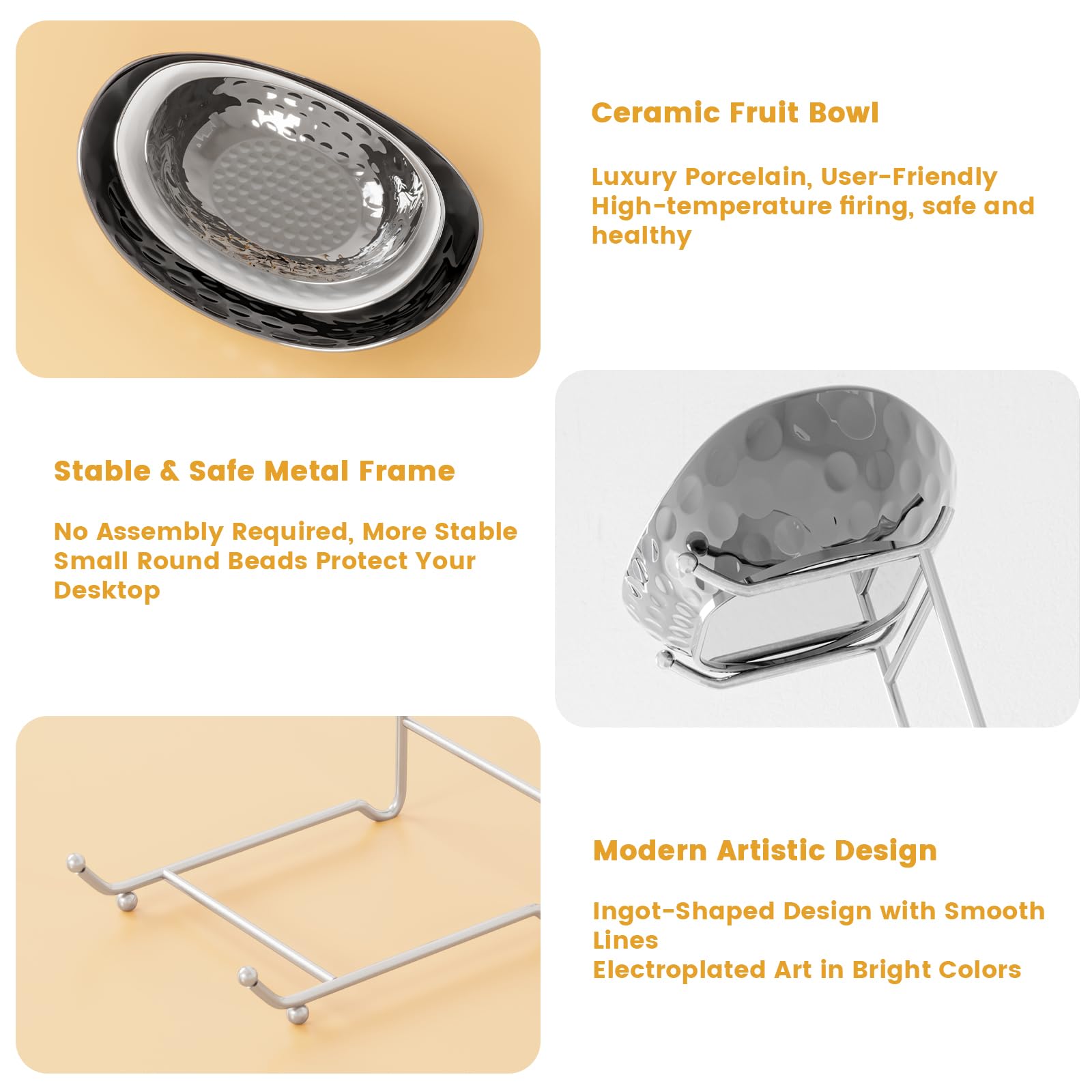 Easy to clean and install: These porcelain serving bowls are easier to clean than ordinary stainless steel fruit bowls. Dishwasher, microwave, and freezer safe. The integrated fruit basket stand is a thicker metal frame with good load capacity.