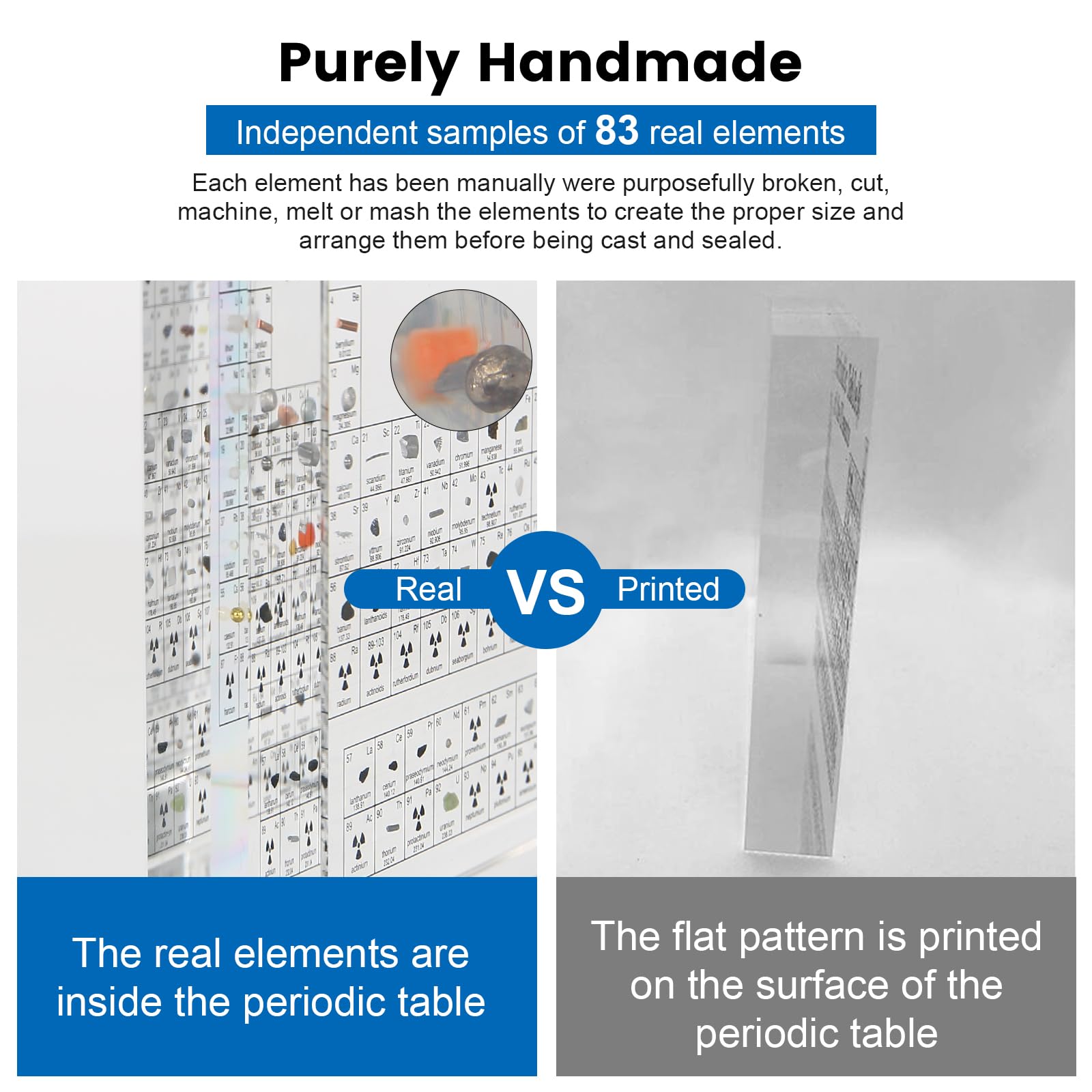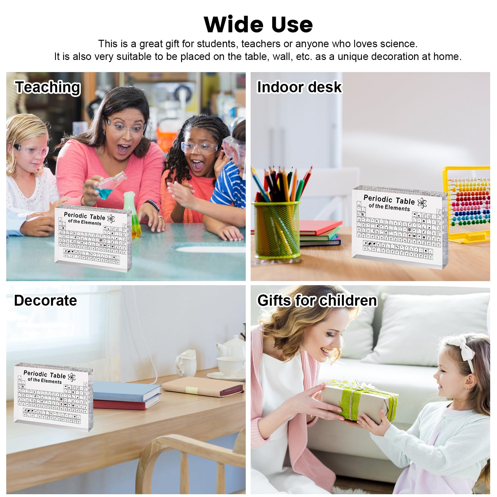 ["[83 embedded elements] - The elements are embedded in the product, which is not easy to carry and can remain visible for a long time. The material is made of imported, highly transparent acrylic, and the elements are clearly visible in the product. This provides an appealing look and is more practical for learning.","[Dimensions] - 8.27 x 5.51 x 1.06 inches, thickened and improved version of the periodic table of elements made of acrylic. Compared to other companies, our products are larger, thicker, and more transparent, with corners and edges also processed. The rounded shape is comfortable and prevents accidental finger injuries, further enhancing safety.","[Multicolored illumination] - The updated version of the periodic table clock with acrylic elements and base can have a button to switch the light, featuring colors such as red, green, purple, and others. The base is not only stable, but the light is also more vivid and each element is clearly visible, increasing the fun of learning and making it more practical to see the element pattern in the light than in the dark.","[Safe and non-toxic] - The product contains 83 types of real elements that are clearly visible but do not contain radioactive elements, ensuring safety and non-toxicity. We guarantee not only practicability but also safety.","[Wide range of applications] - This periodic acrylic element system can be used not only for self-study at home or in the family room, but also for teachers' classroom teaching and presentations, and even as decoration. The board is transparent, beautiful, and generous, with little cloudiness, light weight, and high strength. It can be placed on the table as a decorative ornament, very simple and beautiful."]