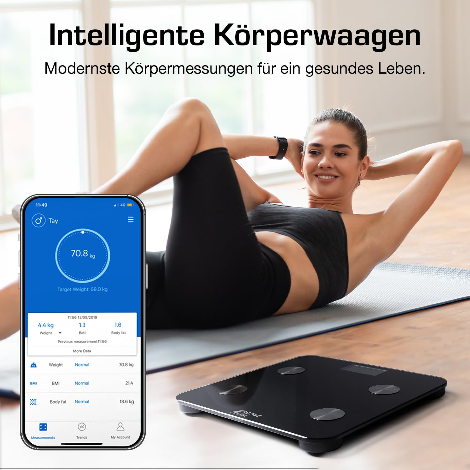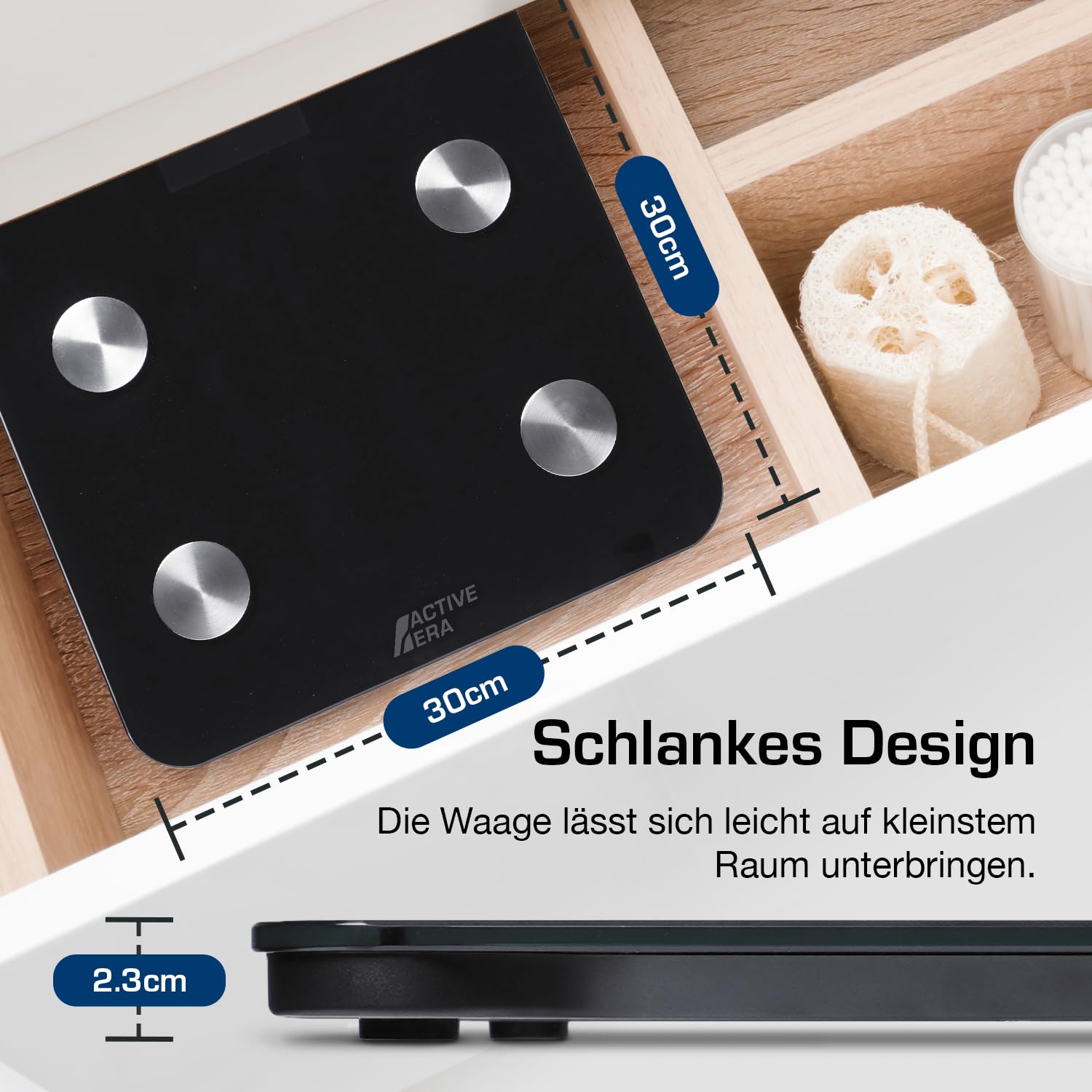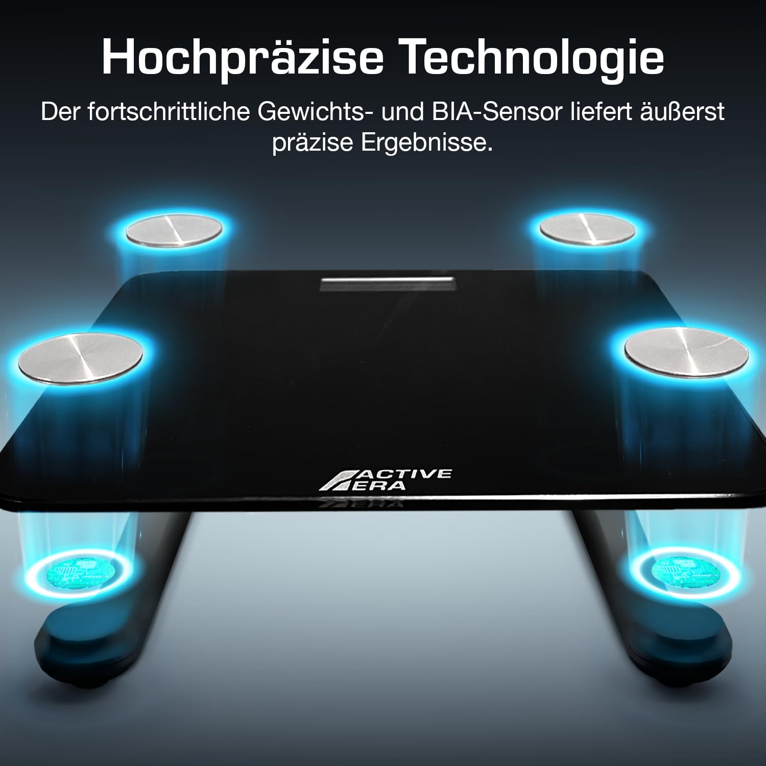 Active Era Body Fat Scale - Digital Bathroom Scale with App - Smart Bluetooth Scale for Body Analysis - Body Fat, BMI, Weight (max. 180 kg), Muscle Mass, Water, Protein, Bone Weight - Black