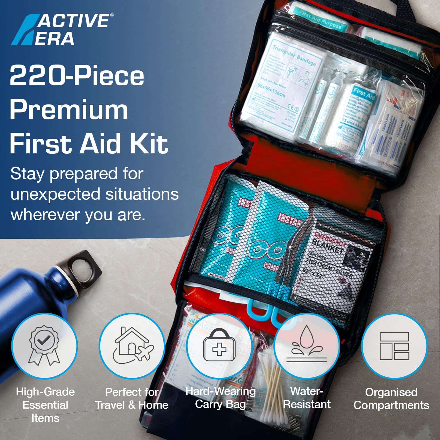 Active Era First Aid Kit, 220-piece premium first aid bag - first aid kit including instant cold packs, eye wash, bandages, rescue blanket for home, office - First Aid Kit ISO 13485.