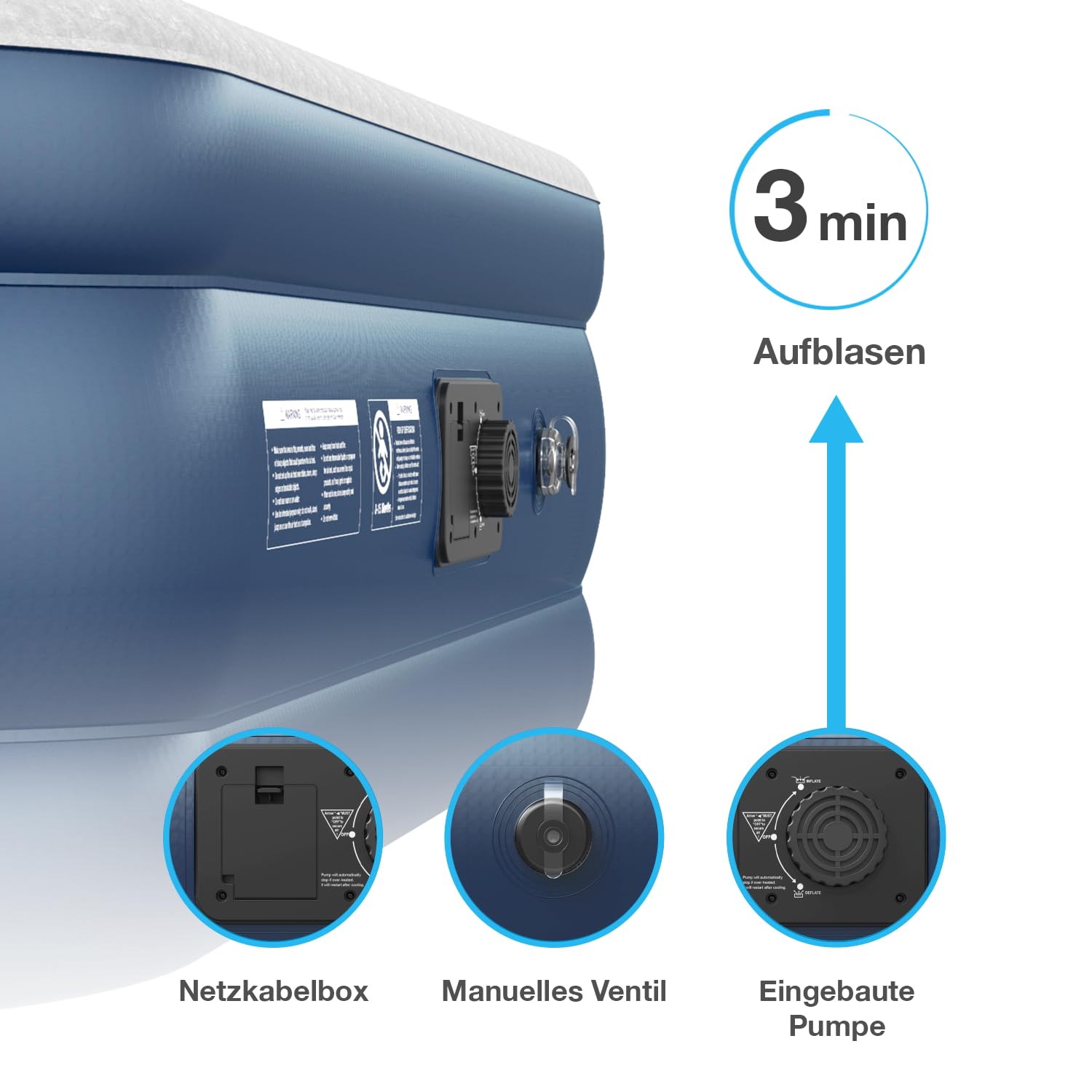 Built-in electric pump: The built-in air pump inflates the air mattress completely within 3 minutes. Additionally, the camping bed can be easily deflated with it, for optimal and space-saving storage.