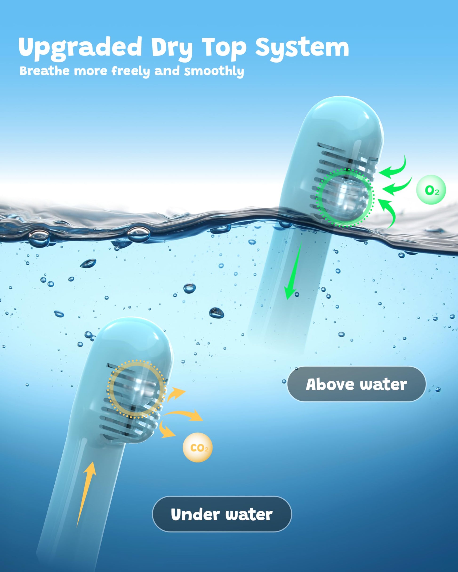 "Safety first for children - Your child can easily breathe through the nostrils and mouth. Our innovative breathing system provides a 345% improvement in breathing ease compared to other full face snorkel masks on the market. A separate breathing chamber ensures a continuous airflow in the mask. Combined with controlled CO₂ levels, this makes it one of the safest full face snorkel masks available.