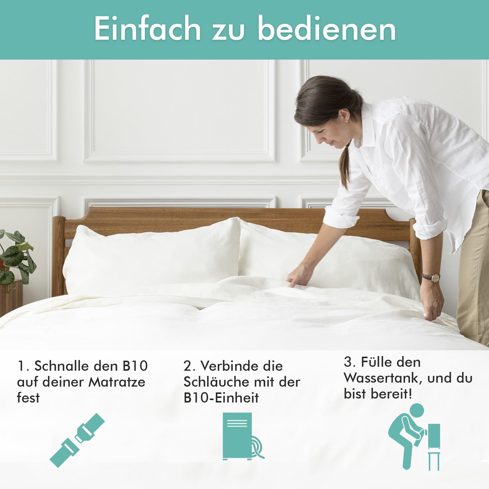 "USER MANUAL & SOLID SAFETY: Invest in a good night's sleep with the B10 bed cooling. Before setting up your B10 bed cooling device, we recommend thoroughly reading the user manual. It provides clear instructions on how to use and maintain the bed cooler for optimal long-term performance. If issues arise, our 24/7 customer service is available. Your comfort is our top priority."]