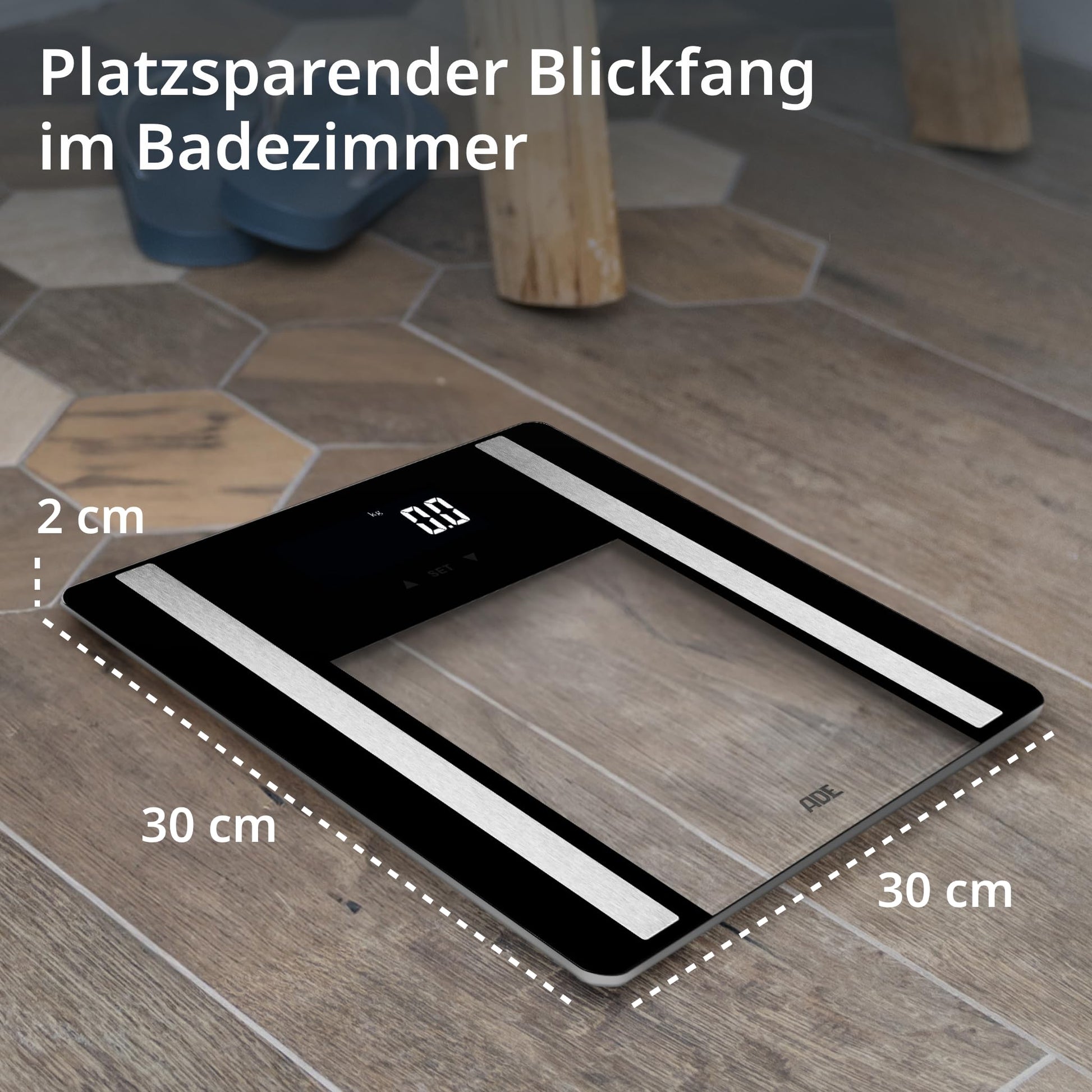 "Compact and practical: With dimensions of 11.8 x 11.8 inches and a height of only 0.8 inches, this scale is very slim and space-saving. Includes 2 AAA batteries and a German user manual."