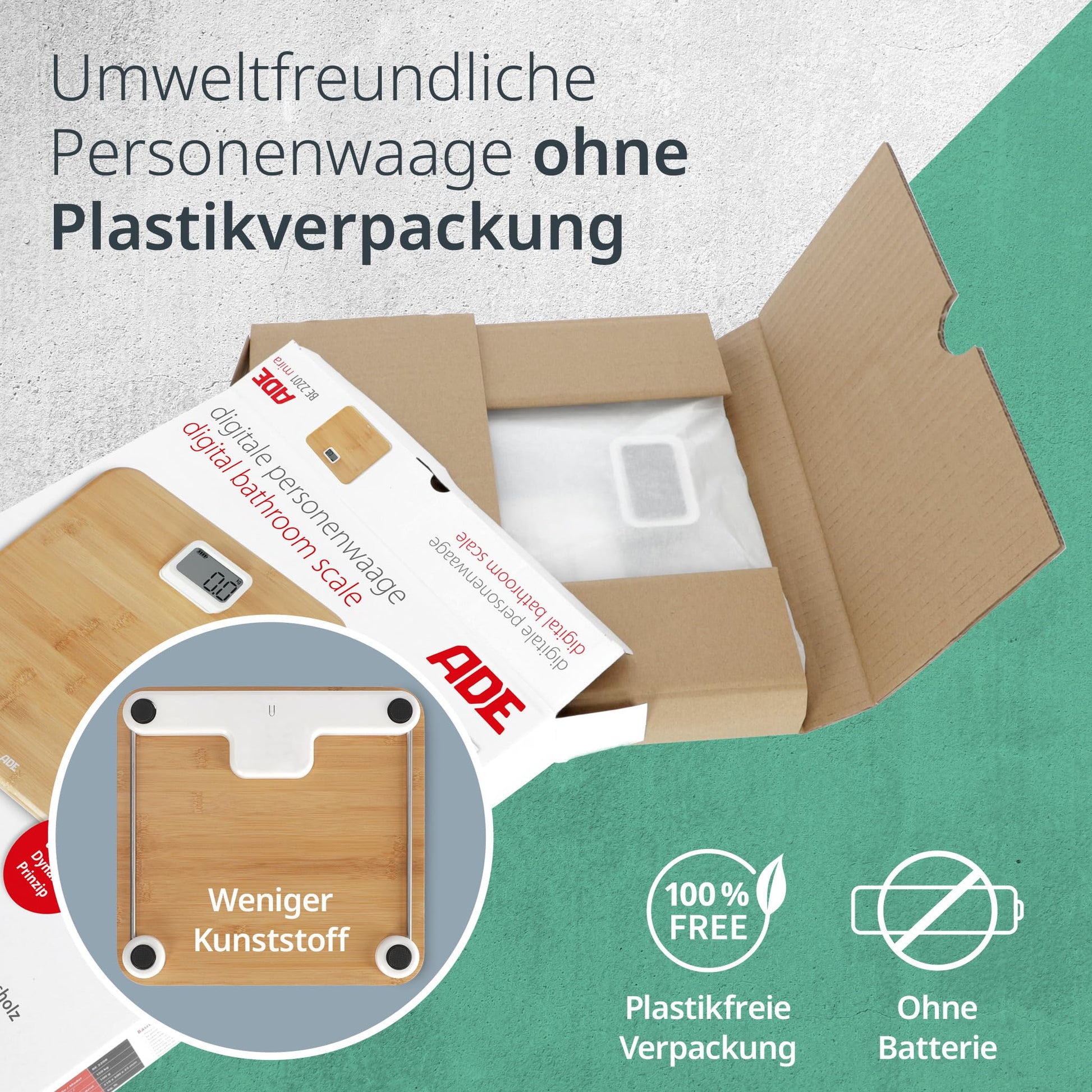 ["Digital bathroom scale without batteries: By pressing the LCD display three times (5.9 x 3.2 cm), enough kinetic energy is generated for one weighing process. Never buy batteries again! Warm wood feeling on the feet. Beautiful design with rounded corners","Sustainable & accurate: The digital body scale is very light, largely avoids plastic in its construction, and has a weighing surface made of renewable bamboo wood","Functions & dimensions: The bathroom scale weighs up to 150 kg in precise 100 g increments, displays weight in kg and lb. With overload indicator and automatic switch-off. The digital scale BE2107 Kiana is 31 x 30 x 3 cm in size and weighs 1 kg","Hamburg traditional brand ADE: Our customers benefit from 85 years of experience and the high precision and reliable quality of our products","Please note: For accurate measurement results, the scale must be placed on a flat, solid surface with all four feet, preferably tiles or parquet, no carpet"]