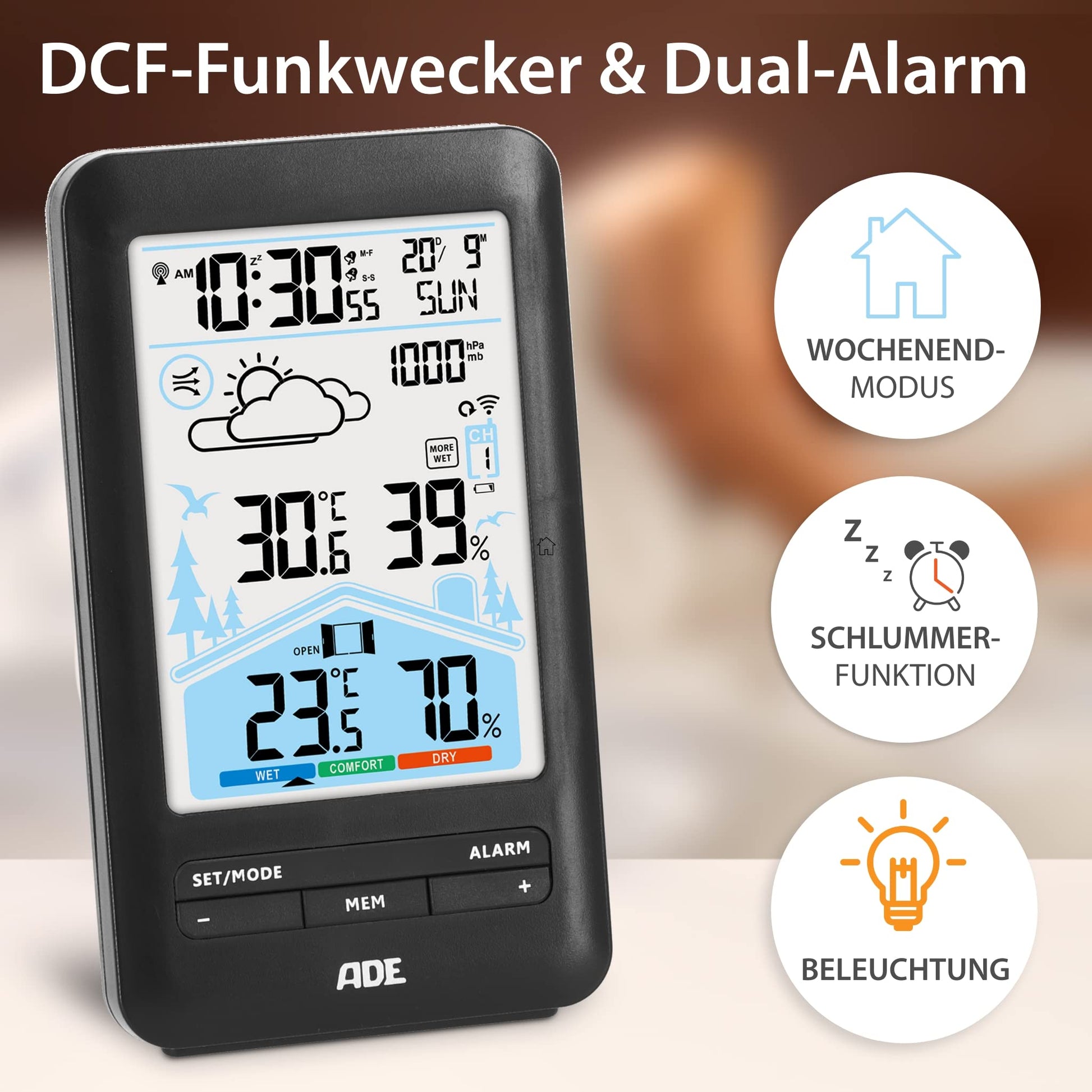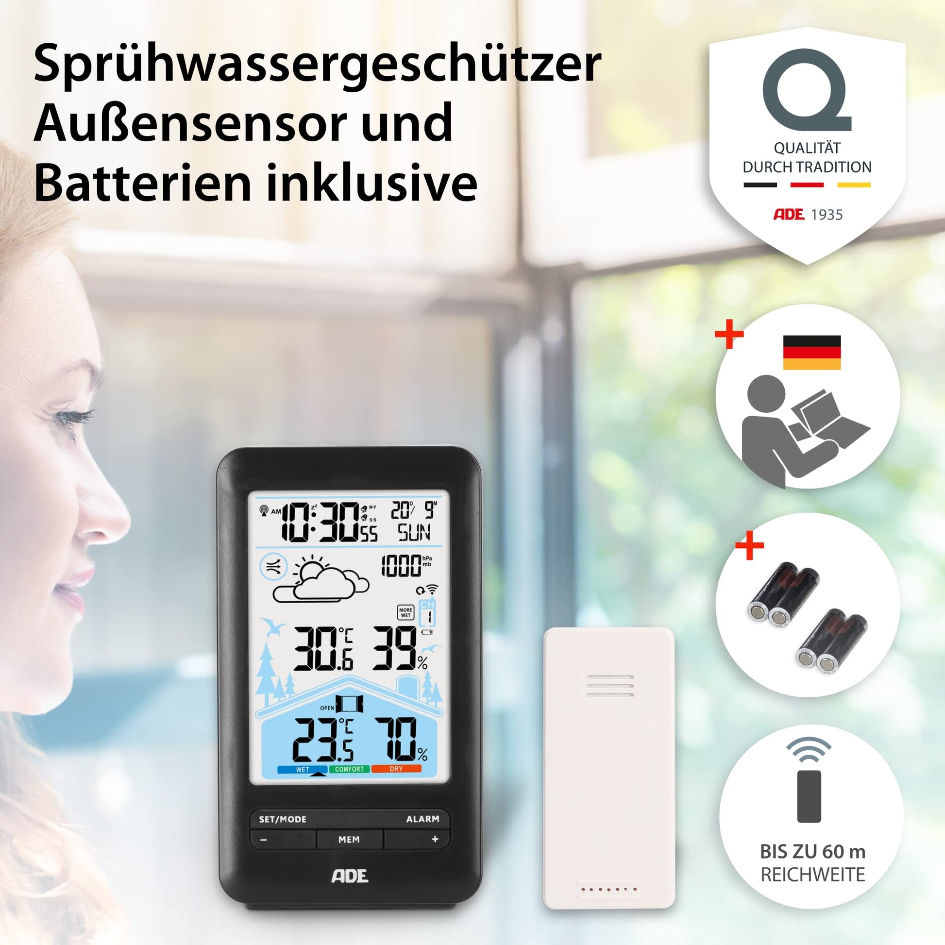 ADE weather station with radio control, outdoor sensor, and radio alarm clock. Includes ventilation recommendation, hygrometer, thermometer, 2 alarms, animated weather forecast, snooze function, and LCD color display.