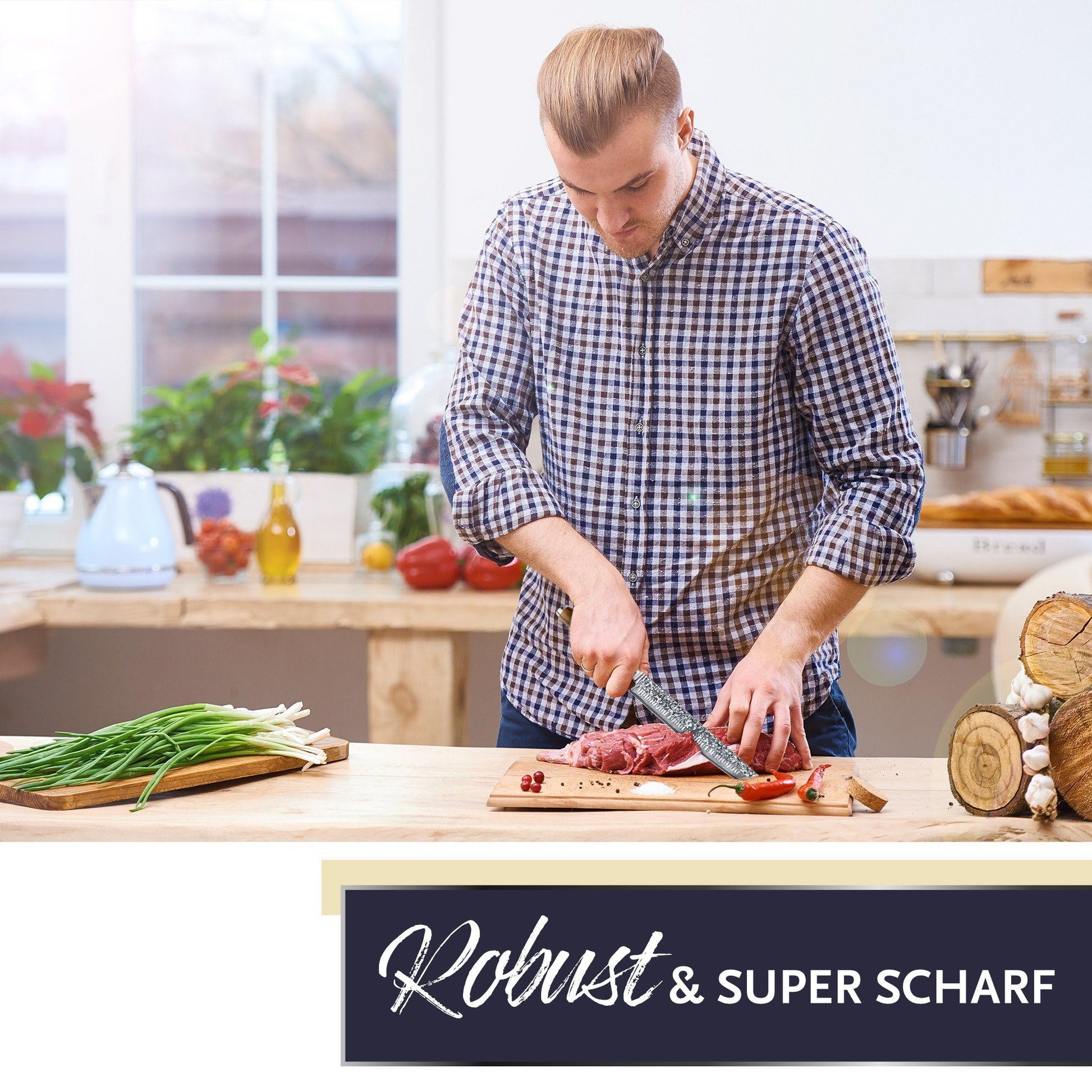 ["THE ULTIMATE BRISKET KNIFE - Whether on the grill, in the barbecue smoker, or sous vide cooked: To cut the famous Beef Brisket and other tender BBQ meat, you need the right tool!","LONG SPECIAL BLADE - The Brisket knife's length and shape resemble a ham knife or salmon knife, but with a rounded tip to prevent the meat from falling apart when slicing.","JAPANESE DAMASCUS STEEL - For the sharp blade, we use genuine handcrafted Damascus steel from Japan: The hollow grind allows the tender meat to release gently from the blade.","EVEN WOODEN HANDLE - Even when cutting firmer meats like ham or roast, the carving knife rests comfortably & securely in the hand thanks to the ergonomic walnut wooden handle."]