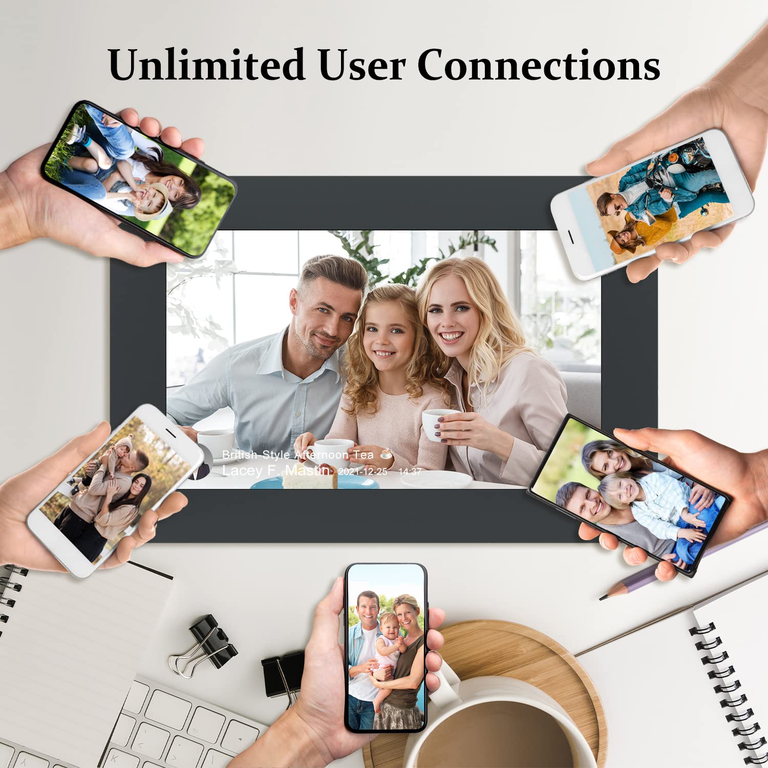 ["【Ultra HD Visual Experience】AEEZO 10.1-inch new smart photo frame is equipped with a 1280*800 IPS touchscreen, which can perfectly display the clarity and color of photos and videos. It supports fast clicking to browse photos, delete videos, or pause slideshows, and automatically adjusts to horizontal or vertical status according to the layout.","【Easy Setup and Wireless Sharing】Use the Aimor APP (for Android and iOS devices) Download it from Google Play or the App Store and connect it to your digital Wi-Fi photo frame. You can also invite up to 512 friends or family members to share a great moment together. Even elderly people who are not familiar with electronic products can easily use them.","【32GB Expandable Storage】Electronic photo frame comes with built-in 32GB storage can store and present over 60,000 photos, making it easy to view your collection of photos. Keep your precious memories close by. In just a few minutes, you can add photos or videos (up to 15 seconds) and add captions to photos. Supports SD cards for expanded storage with a maximum capacity of 128GB, allowing you to store more images and longer videos.","【Not Just a Digital Picture Frame】Our current digital picture frame supports weather, video, photo, calendar, clock, and set automatic on/off function. The automatic rotation function can actively detect your preferences. It can automatically rotate your photos and provide the flexibility to display them in portrait or landscape mode, ensuring that the orientation of the photos fits perfectly in the frame.","【Share Precious Moments with Loved Ones】Digital photo frame with Wi-Fi function allows instant sharing of memories, so you can share the latest great times with your favorite people anywhere, anytime. It is the best gift for your family, friends, and loved ones on Mother's Day, Father's Day, Thanksgiving, Christmas, birthdays, weddings, and other special holidays."]