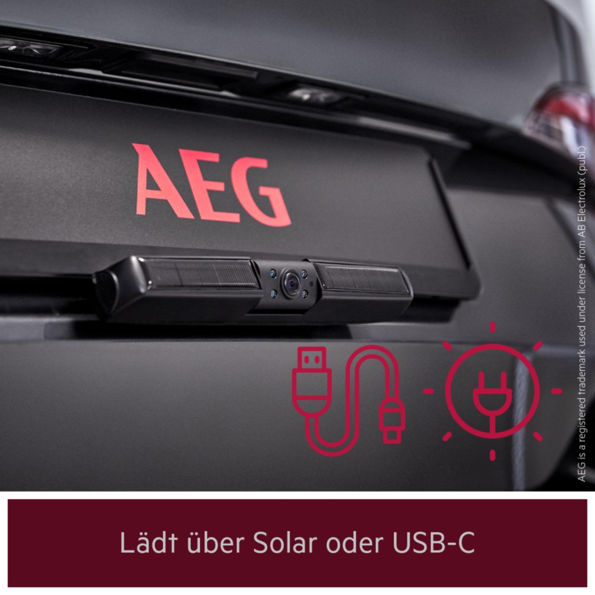 ["Battery power supply via solar and USB and rechargeable and interchangeable 2,600 mAh battery","4.3'' TFT color monitor and night vision function via IR LEDs and 2.4 GHz radio transmission and signal range up to 30 m and further 110° viewing angle","Optionally displayable distance aid lines and water-resistant CMOS system (IP65)","Suction cup mounting with articulated arm for windshield","Easy installation thanks to plug & play","Additional camera RZ 4.3 is ideal for the wireless AEG Solar backup camera system RV 4.3","Delivery includes: TFT monitor with mounting bracket, solar camera with holder, 12 V car connection, USB cable"]