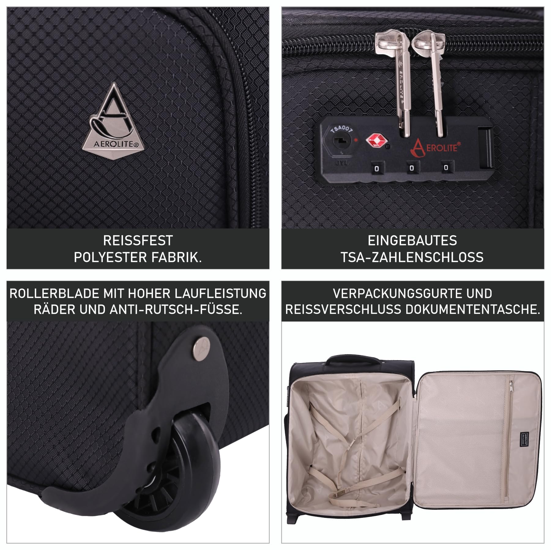 ["Maximum size for British aircraft, Jet2 and EasyJet - We designed this suitcase to measure exactly 22 x 18 x 10 inches. This is the maximum cabin size allowed when flying with British Airways, Jet2, and any of the EasyJet Plus/Flexi/Extra Legroom/Up Front/large cabin upgrade options. This way, you can always pack the maximum for your flight! Body dimensions (without wheels/handle): 21 x 18 x 10 inches. Weight: 5.7 lbs. Capacity: 60 liters", "Strong, lightweight, and eco-friendly. - The outer shell is made of durable 600 denier jacquard polyester, resistant to wear and tear yet ultra-lightweight, allowing you to carry more weight for your belongings. Inside the suitcase, there is a fully lined interior with eco-friendly material made from recycled plastic bottles. Inside the lid, there is a convenient zippered mesh pocket for important documents. The internal compression straps keep your clothes in place while traveling.", "Take the strain out of traveling - the suitcase features 2 high-performance rollerblade wheels for effortless smooth towing on a variety of surfaces. It also has a double tube telescopic aluminum handle that extends to a total height of up to 1 meter. The handle extends through the convenient push-button release mechanism and can be easily retracted back into the suitcase when not in use.", "Additional storage space - Transporting as many essentials as possible with as little inconvenience as possible is the name of the game for any flight. The exterior features a large lower front pocket with double zippers for your books, magazines, headphones, electronic devices, and refreshments, as well as a smaller upper pocket for your essential items that need quick access, such as passports, boarding passes, and travel money.", "Chunky exterior zippers and integrated TSA lock: The bag features a double zipper system with high-quality, chunky SBS zippers for easy and reliable closure. The suitcase has an integrated TSA-approved combination lock for added security for your belongings. On the back, you will find a convenient address tag in case your suitcase is misplaced, as well as a very useful attachment strap to mount the suitcase over the luggage trolley handle.", "Excellent 10-year warranty: Aerolite takes pride in the quality and durability of their cabin luggage suitcases; so much so that they offer a 10-year warranty replacement service that covers all manufacturing defects - so you can buy with absolute confidence!"]