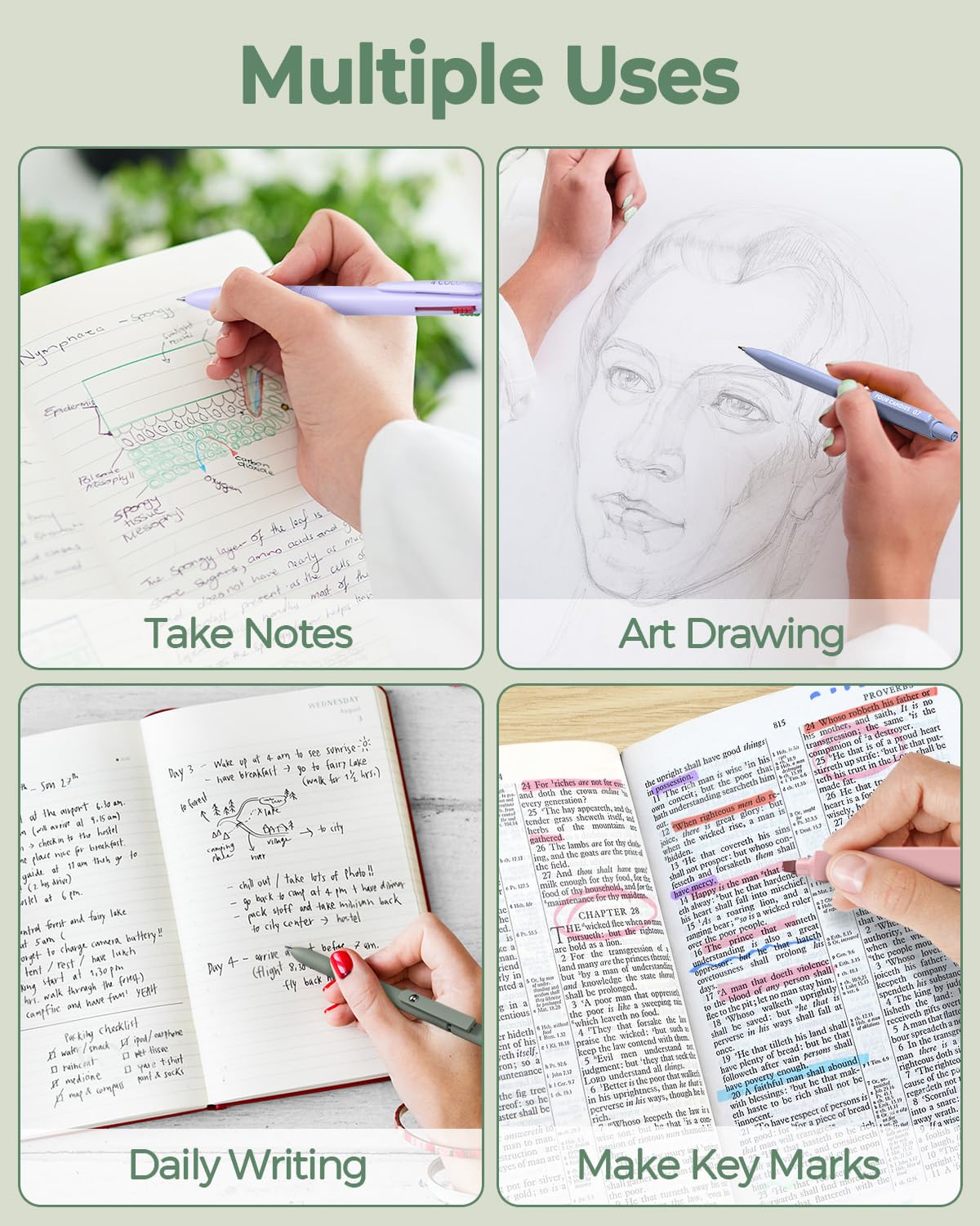 6 PCS retractable ballpoint pens: This 4-in-1 multicolor ballpoint pen comes with black, blue, green, and red ink. By pressing, you can select the color you need for your notes. With this essential pen in nursing school, you can create eye-catching to-do lists in various colors with just one tool.