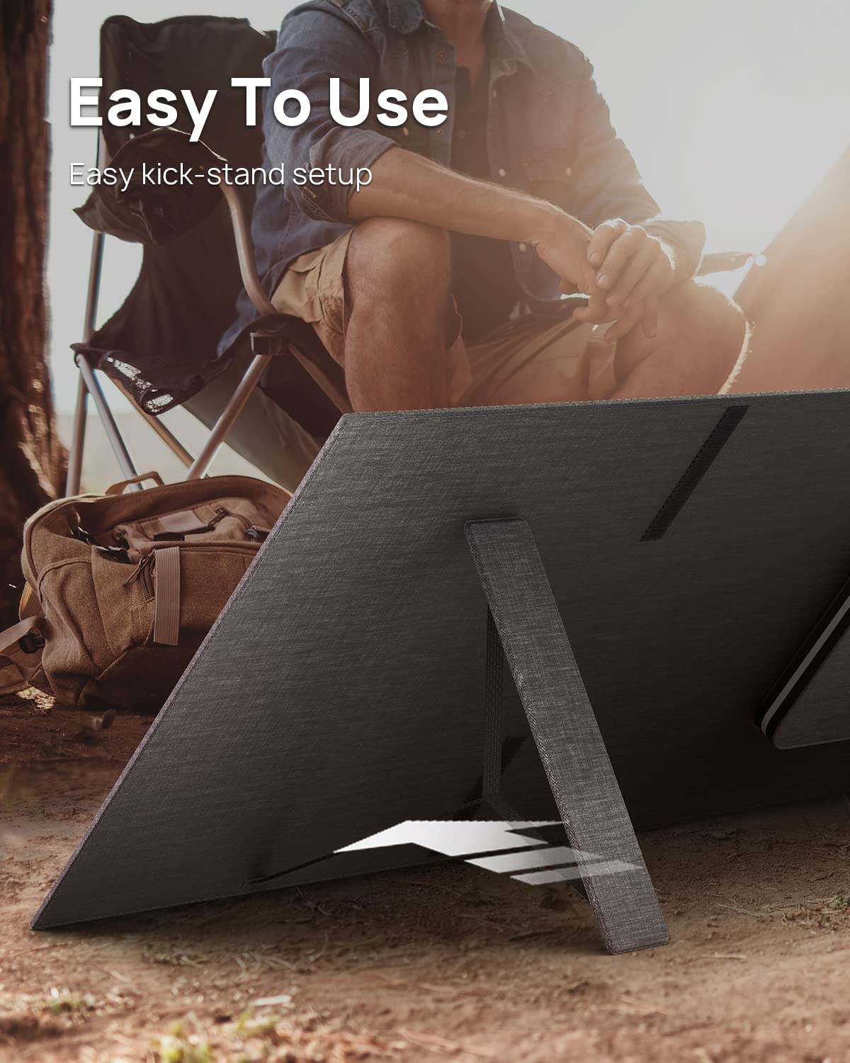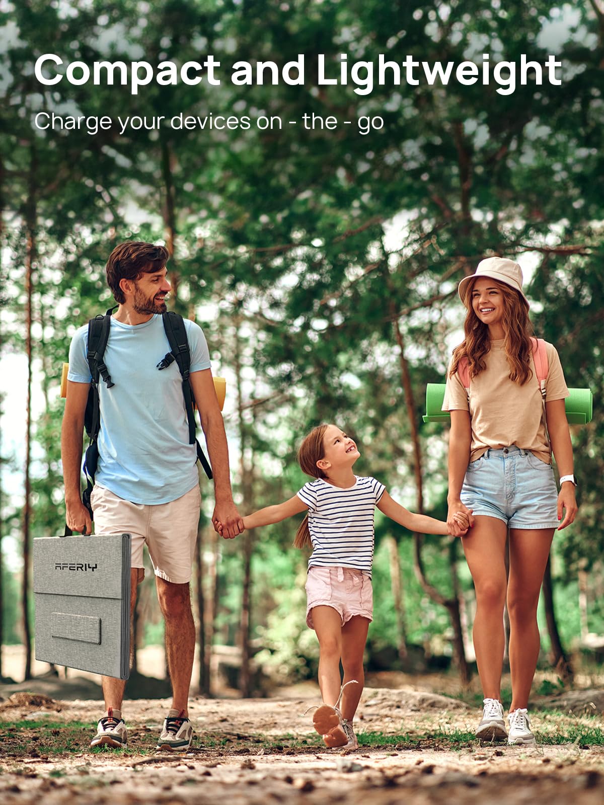 ["【High Conversion】 AFERIY Solar panel 100w, it uses highly efficient monocrystalline silicon solar cells with a conversion rate of up to 23%. Thanks to advanced MWT technology, it can absorb solar energy to the greatest extent and accelerate charging. It has FCC, RoHS, and CE certifications to ensure reasonable safety.","【Foldable & Only 5.7lbs】 The AFERIY 100W Solar panel is foldable, compact and weighs only 5.7lbs, our AF-S100 Solar panel is half as light as other brands with the same capacity. You can take this solar panel anywhere you need solar power. The stand can be expanded and stowed at will, which is a very practical design.","【IP65 Waterproof & Durable】 The surface made of Oxford fabric and precision stitching prevent the solar panel from being damaged by moisture, etc., making it more durable. It is IP65 waterproof, which will protect it from water splashes (Please dry it in time, do not immerse it in water), the side pocket can be used to store the power cord and protect the charging port. It is the perfect partner for outdoor camping.","【5 Outputs】 This 100W Solar panel has Built-in USB*2 (QC3.0) + Type-C (PD 18W) + DC5521 + MC4-Anderson cable, supports charging up to 5 devices simultaneously. It is not only widely compatible with most solar generators on the market, but also suitable for RVs, cars, boats, and charging phones and cameras directly.","【36 Months Warranty】 You will receive 100W Solar panels + User manual + Warranty card. If you have any questions after purchase, please do not hesitate to contact us for a prompt response (Although we make every effort to ensure quality, we cannot guarantee infallibility)."]