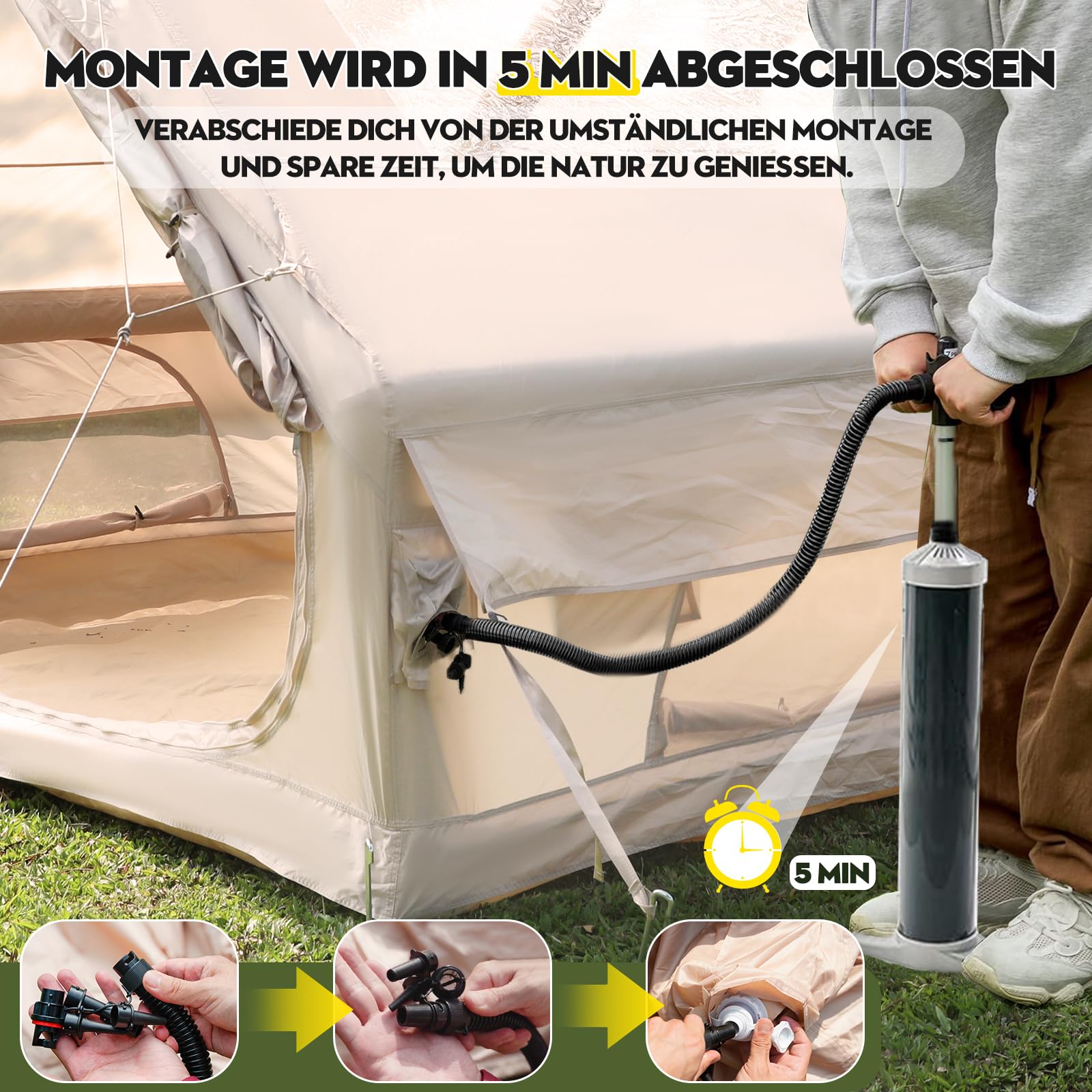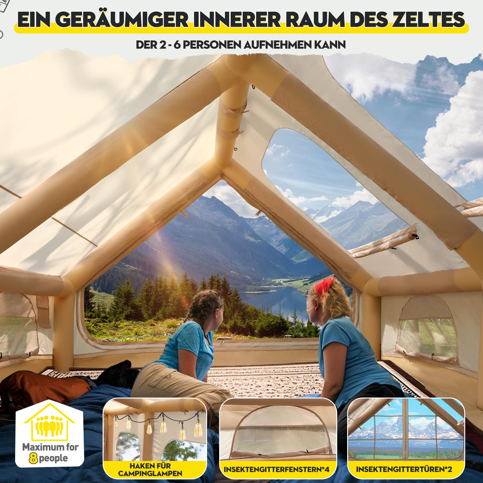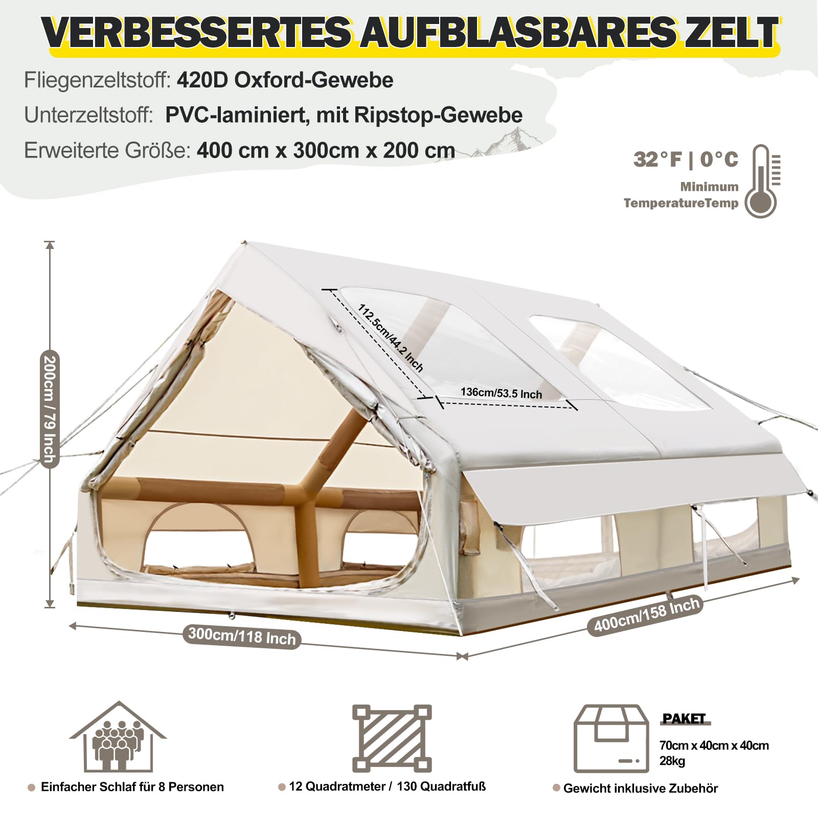 ["🏝️【Spacious Design & Comfort Enjoyed】Our inflatable tents offer various sizes for different needs: 300x210x200cm (67.8 sqft) for 2-4 people, 300x250x210cm (86.1 sqft) for 4-6 people, 400x300x200cm (129.2 sqft) for 4-8 people, ensuring a spacious atmosphere and making every camping trip extremely comfortable. All models provide enough space for camping gear such as air mattresses and sleeping bags, ensuring your outdoor trip always runs smoothly.", "🏞️【Sturdy Material & 5 Min Quick Installation】Afitdon inflatable tent Made of high-quality, waterproof 420D Oxford fabric, which is both durable and waterproof. The built-in PVC air columns provide extra stability and durability. With the included air pump, the tent can be quickly set up in just 5 minutes, saving time and effort and allowing you to quickly enjoy nature.", "⛺️【Excellent Ventilation & Refreshing Experience】Equipped with 4 double-layer mesh windows and 2 doors, the inflatable tent ensures optimal air circulation. The doors and windows on the front and back of the tent not only provide good ventilation but also offer a clear view, making your camping experience refreshing and pleasant.", "🏖️【Smart Design & Comprehensive Features】Our multifunctional inflatable camping tent has various special designs that meet different needs. The model with a chimney opening is convenient for using heaters in cold weather. The roof window design allows you to view the starry sky at night and let more light into the tent during the day. The air conditioning opening design provides coolness in hot weather.", "🏕️【Versatile Uses & Perfect Adaptation】Whether camping, festivals, hiking, or weekend getaways - this inflatable tent is the ideal choice. The spacious interior and sturdy construction meet your comfort and functionality requirements, making it the perfect companion for any outdoor adventure."]