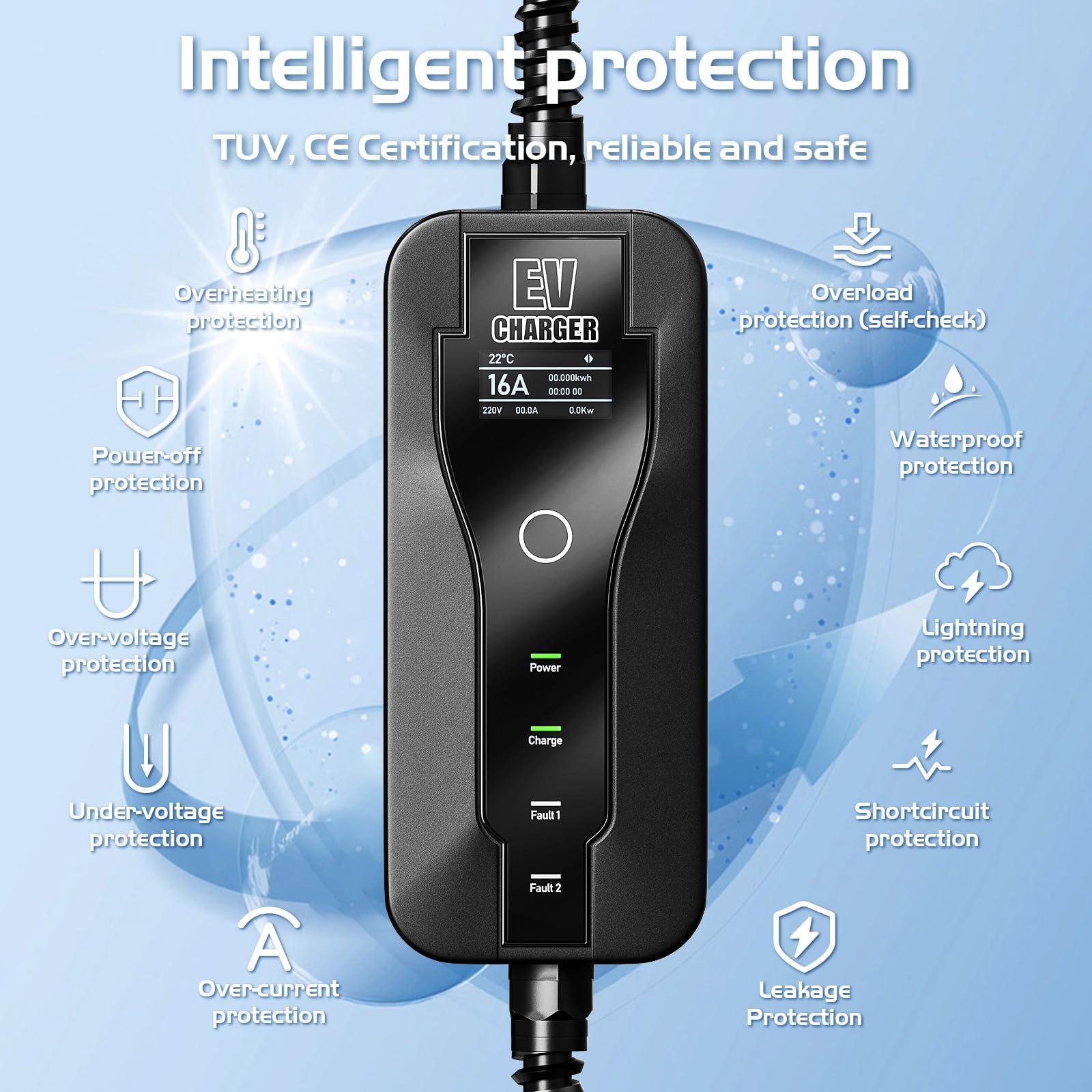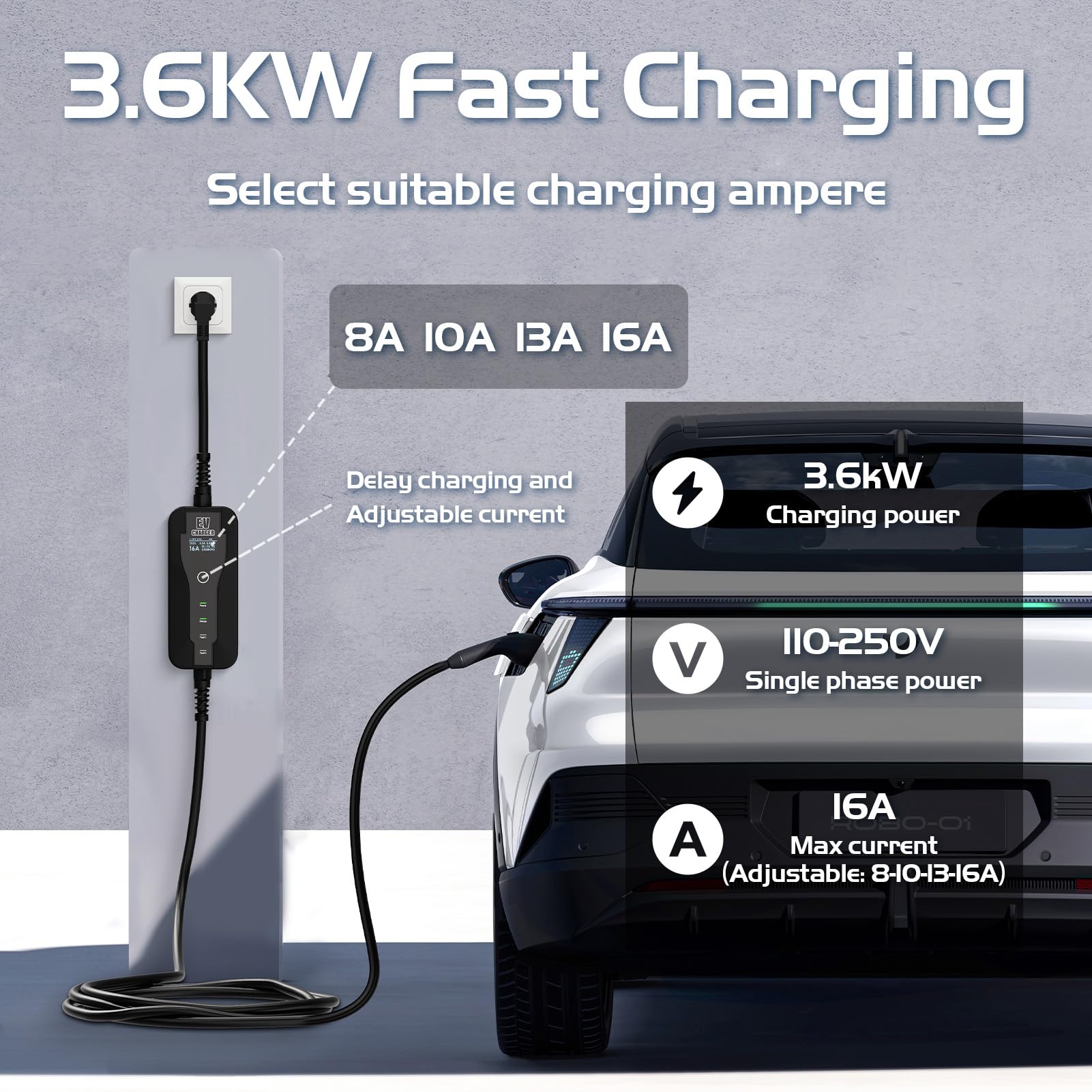 ["Safe and durable: Portable charging cables are made of high-quality materials, safe and durable. They also feature protection functions such as lightning protection, leakage, grounding, overvoltage, undervoltage, overcurrent, leakage, and overheating.","Delayed charging design: The electric vehicle charging cable can adjust the charging time to your personal needs. By selecting the delay function, the charging start can be delayed by up to 15 hours, allowing you to choose a suitable time for charging.","Fast charging: The electric vehicle charger can charge up to 16 A, with 8/10/13/16 A options. You can adjust the current according to daily needs. The maximum power is 3.6 kilowatts, allowing your car to be quickly charged.","Clear digital display: The LED indicator light of the charger charging cable helps you to read the charging status of your car. It can also help you better identify unexpected situations with your machine.","High compatibility: Our electric vehicle charger is compatible with most electric vehicles that comply with the IEC 62196-2 standard."]