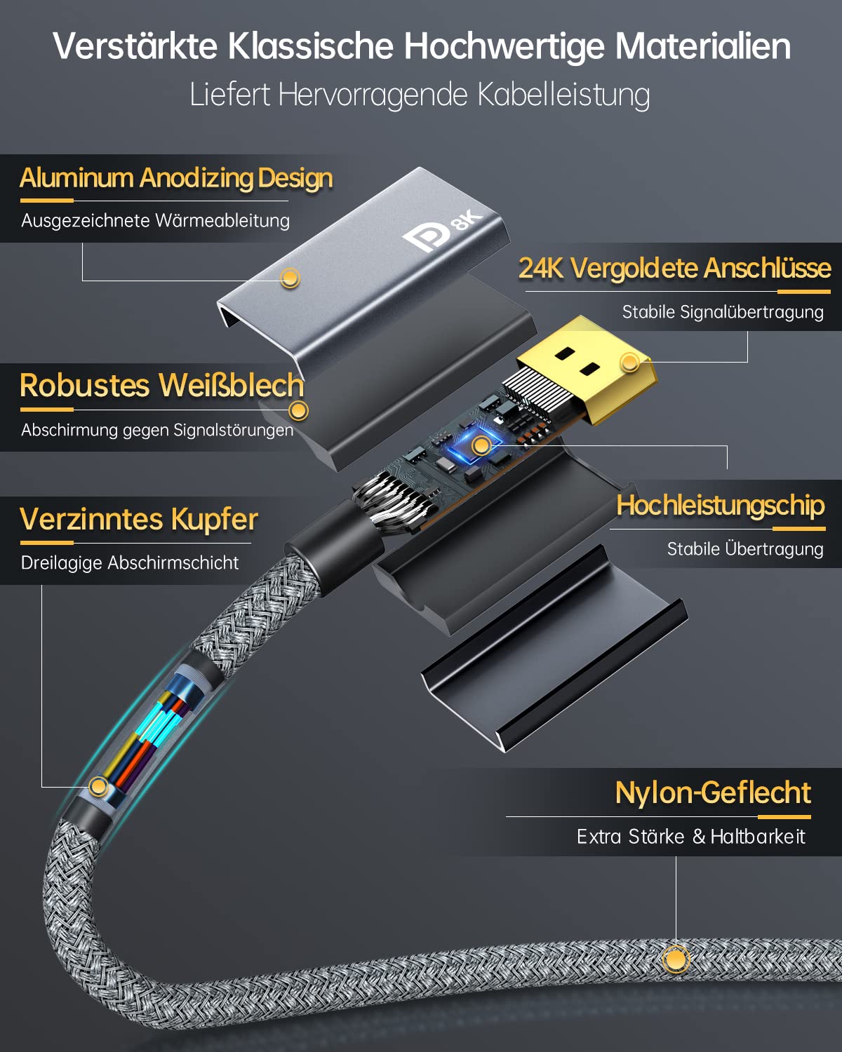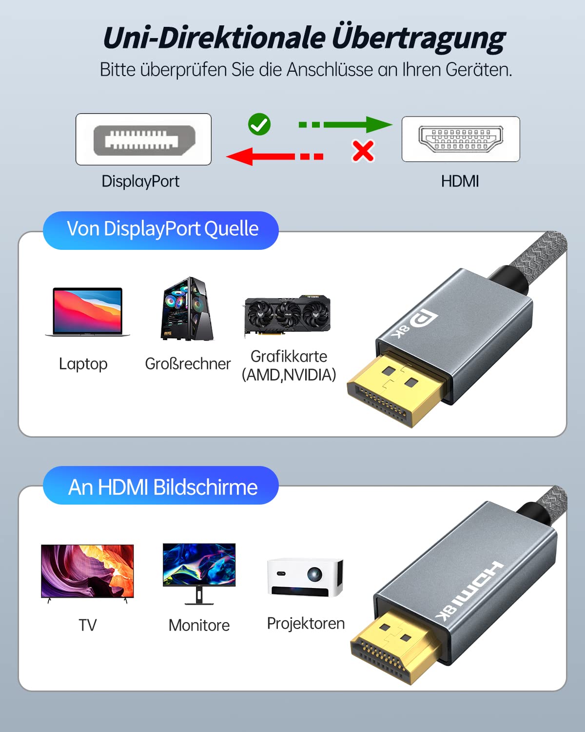 ["【8K UHD EXPERIENCE & UNIDIRECTIONAL】Supports 8K@60Hz, 4K@120Hz, and 2K@240Hz for smooth gaming and crystal clear videos. Due to the limited bandwidth of DisplayPort 1.4 (32.4 Gbit/s), Display Stream Compression (DSC) may be required for extremely high resolutions or refresh rates. Attention! Only DP → HDMI. Not compatible with devices that only have an HDMI output (e.g., PS5, Xbox, Switch, streaming boxes).",