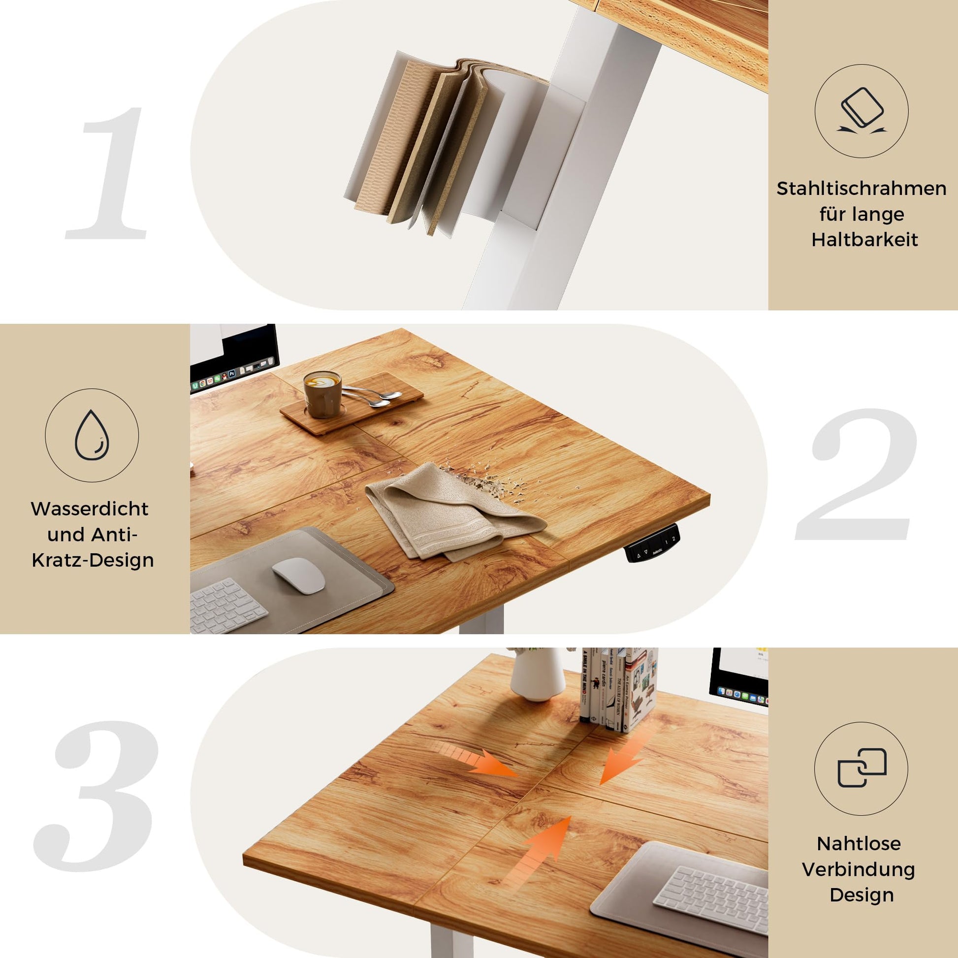 ["Spacious desk design】This height-adjustable desk has been upgraded to provide more workspace. The dimensions have been expanded from 180 cm deep x 60 cm wide to 180 cm deep x 80 cm wide, while maintaining a height of 75 cm. This improvement significantly increases your work and storage space, ensuring that office supplies and personal items are better organized and accessible.","【Intelligent lifting system】The ergonomic desk can be continuously adjusted between standing and sitting positions (72 cm to 128 cm) and features a height memory button that allows you to easily set and recall your preferred working height. It is made of low VOC desk materials that comply with national safety standards and is equipped with hooks on both sides, making it an easy and practical choice for daily use.","【Sturdy and durable frame and reliable motor】Design ideas with industrial steel frame and T-frame ensure that this sit/stand desk can support a maximum load of 70 kg. In addition, the motor has passed 50,010 international lifting tests to ensure long-term reliable operation of the workstation.","【Anti-collision technology】If the lifting table encounters an obstacle during adjustment, it moves 12 cm in the opposite direction to avoid potential damage or injury.","【Easy assembly】Assembling this height-adjustable desk is very easy and only requires a few steps. Assembly instructions and tools are included in the package, and we also provide installation videos as guidance. If you have any questions or warranty details during assembly or use, feel free to contact us."]