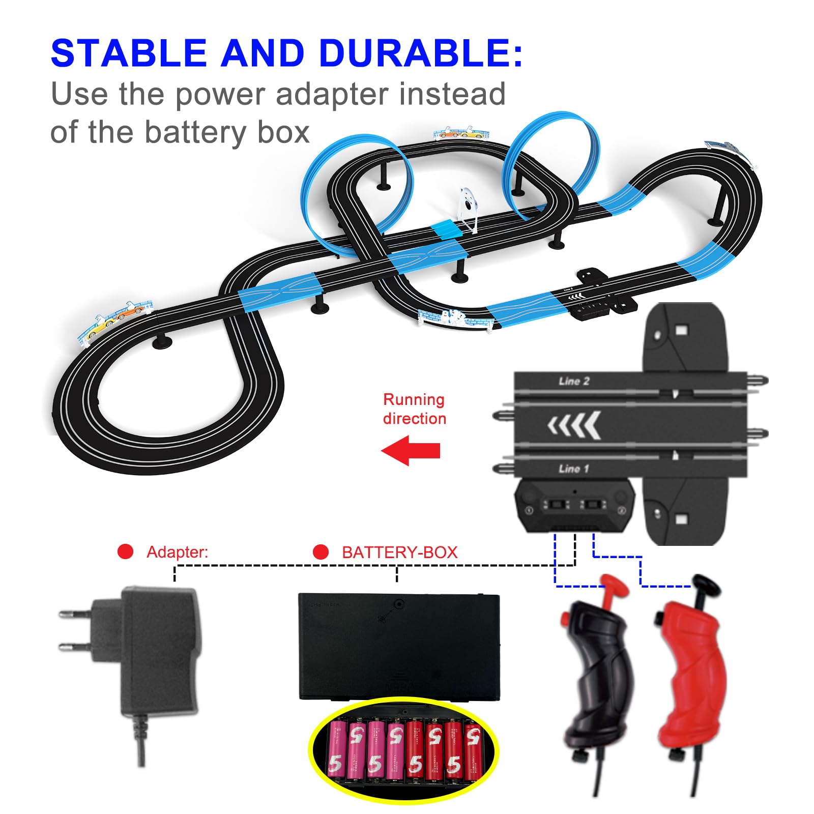 "Realistic Race Track: Our slot car race track sets simulate a variety of race tracks, including simple straight tracks, S-shaped tracks, circular tracks, and exciting double-layered overpass tracks. Provide racers with the coolest racing experience. Our race track also features an automatic lap counting function that can record the race status in real time, allowing racers to focus on the race."
