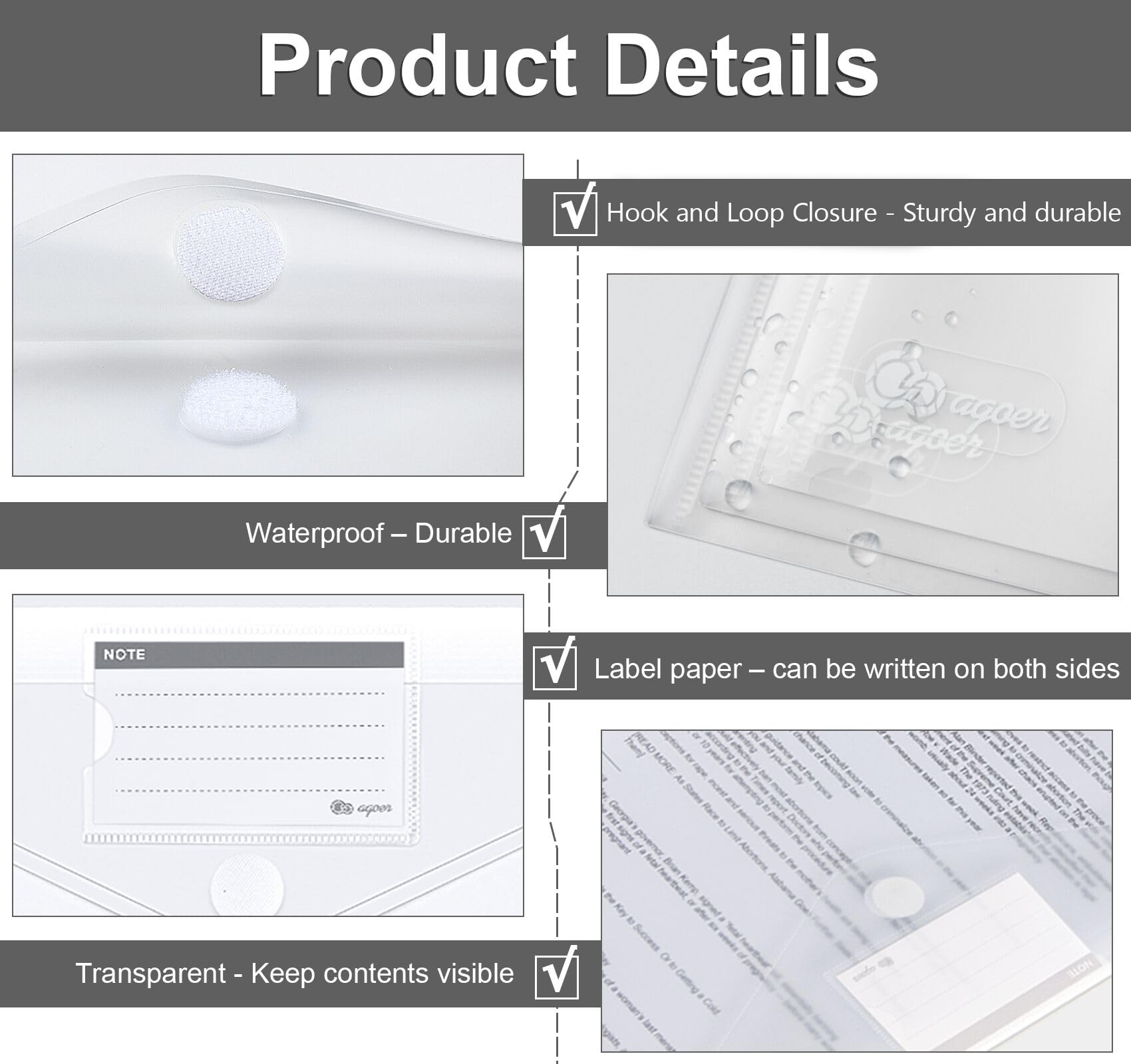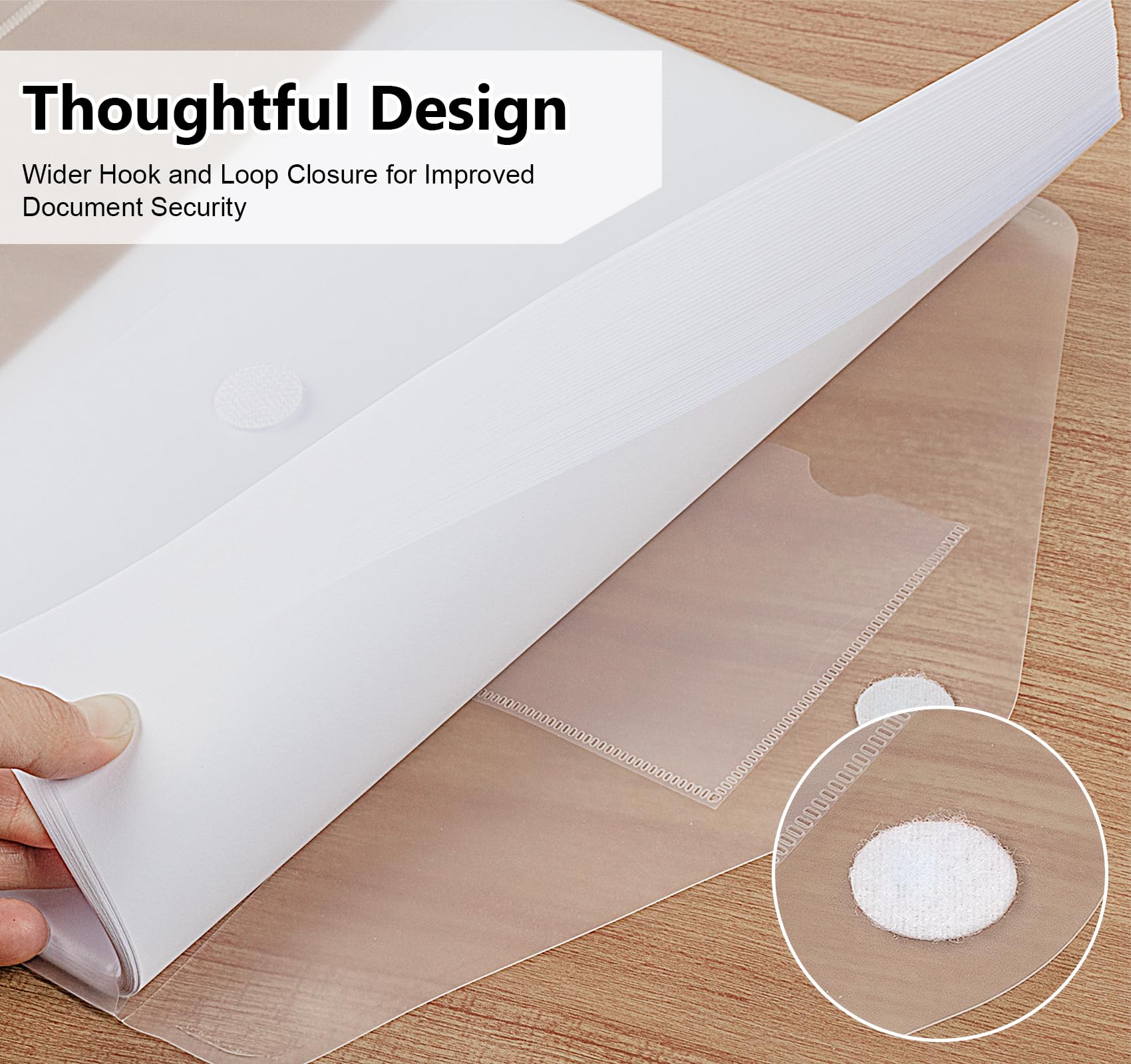 Agoer 48 Piece A4 Document Wallet with Velcro Fastening, [Wider Sizes] A4 Filing Folder, A4 Clear Pocket with 11 Hole Edge for Organizing Documents with Label Pocket.