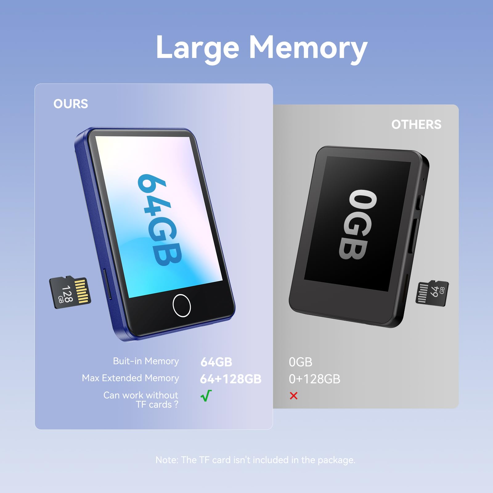 ["đă2.8-inch Color TouchscreenăMP3 player with 2.8-inch full touchscreen, mirror design, full color, clear image quality, and easy operation in full-screen mode. Comes with a protective film to prevent scratches during use. TFT color screen, read e-books conveniently and eye-friendly at any time. Low power consumption, more energy-saving.","đ§ăWireless 5.3 BluetoothăThe upgraded Bluetooth version makes the connection more stable. Automatically connect to the previous Bluetooth device. You can play songs for hours without connection problems. The transmission speed is accelerated, the connection distance is long, and the anti-interference ability is strong. NOTE: This MP3 player is a Bluetooth transmitter, not a receiver, it cannot pair with cell phones.","đ¶ăLossless HiFi Sound Quality, Intelligent Digital Noise ReductionăHigh-quality chip, support MP3 / WMA / APE / FLAC / WAV / DRM / ACELP and other formats lossless sound quality using a professional intelligent noise reduction master chip, shielding noise and protecting sound can restore the height of the sampling the real sound again.","â°ăBuilt-in high-capacity battery/large storageăEquipped with 64GB built-in memory, you can easily transfer thousands of your favorite music to this MP3 player. It also supports TF card expansion up to 128GB, giving you more space to store music or files. The battery capacity is 410mAh, you can enjoy music freely. Playtime without bluetooth: 43 hours; with bluetooth: 18 hours. Charging time: 2.5 hours.","đăMultifunctional MP3 PlayerăThe MP3 player includes radio (wired headphones required), photos, video display, voice recorder, e-books, calendar, stopwatch, alarm clock, time screen saver, bookmarking playback, A-B repeat, synchronize lyrics. You can use this MP3 player Bluetooth for various occasions such as running, walking, learning, meetings, commuting, etc. Small but fine, it is an ideal gift for music lovers, family, friends, and children. (Note: To improve the transmission speed, please limit the size of each folder to a maximum of 1GB.)"]