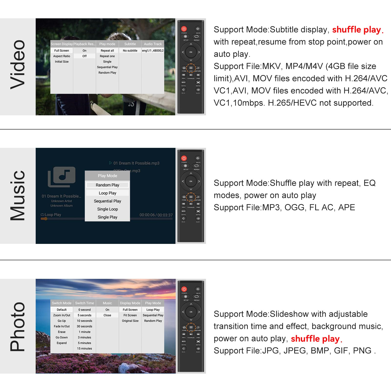 ["【Mini portable】 - Fits in the palm of your hand, perfect travel companion for those with limited space and outlets. Also a compact and easy-to-use multifunctional HD media player for office work and home entertainment", "【High resolution】 - Full HD 1080p supports most video decoding formats: RM, RMVB, AVI, DIVX, MKV, MOV, HDMOV, MP4, M4V, PMP, AVC, FLV, VOB, MPG, DAT, MPEG, TS, TP, M2TS, WMV, (H.264, H.263, WMV9/VC-1, MPEG1/2/4), Does not support VPR files", "【USB Host】 - Drive external USB storage devices such as USB HDD (the partition of the hard drive should be MBR, not GPT), up to 2 TB, can manage, manage, delete, or copy files between devices. Compatible with Windows and MAC iOS", "【Supported devices】 - Reads hard drives formatted in FAT, FAT32, and NTFS. It supports hard drives up to 2 TB and SD/MS cards up to 64 GB. Also plays subtitle files and loop videos", "【Multifunction】 - Autoplay from the breakpoint, support Repeat, Zoom, FF, BF, Rotate functions. Also comes with a handy remote control to easily navigate the menu screen; We stand by our products 100% with a 12-month warranty"]