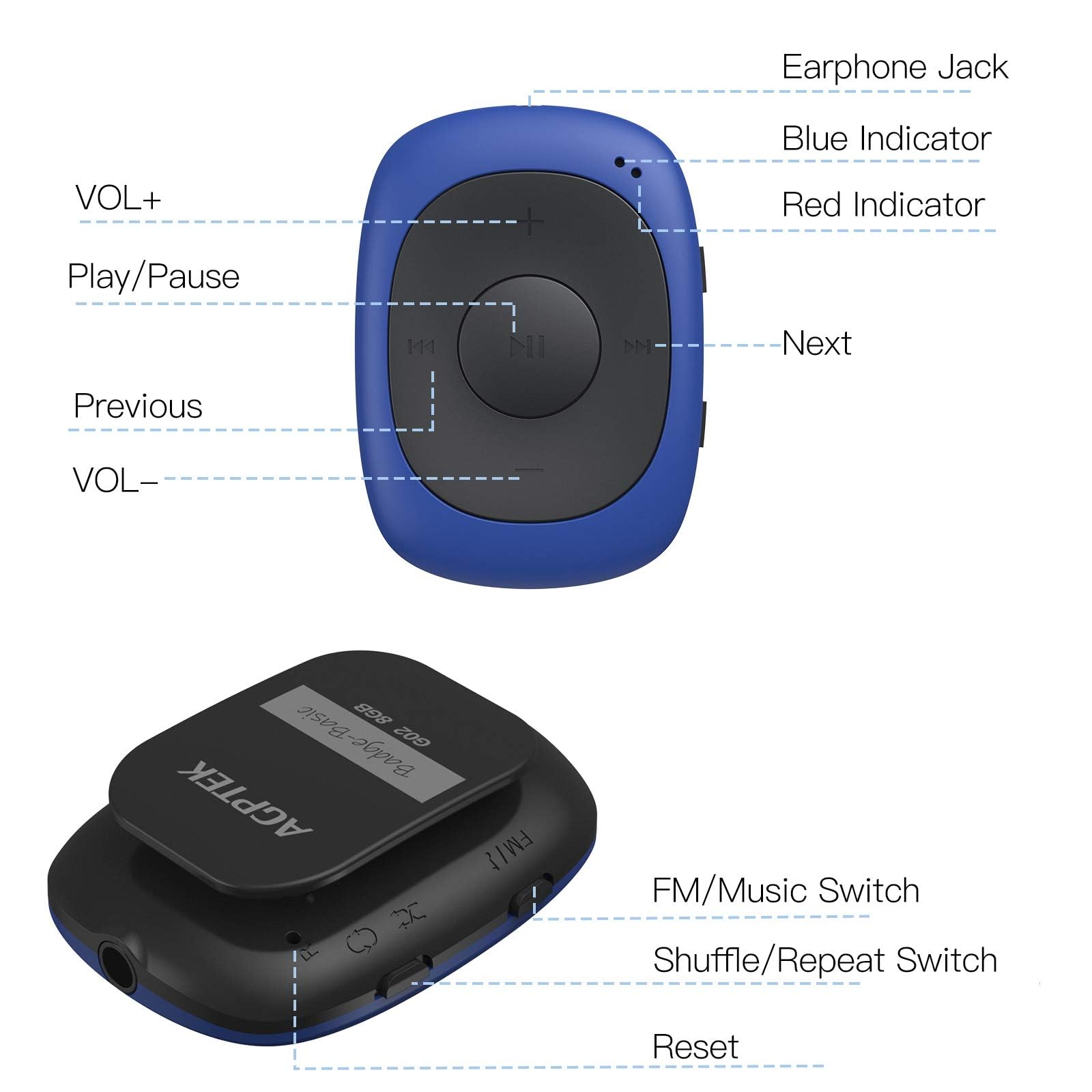 AGPTEK Mini Clip 8GB MP3 player with earhook headphones and silicone case, lightweight sports music player with 5 buttons and 2 function switches, (packaging MULTIPLE USE) Blue.