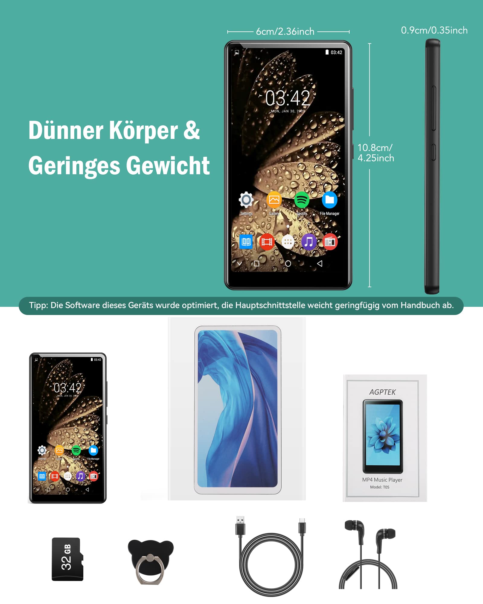 AGPTEK WiFi MP4 player with 4" touchscreen, 1000mAh battery, 1GB RAM, 8GB ROM, HD video player with Android 6.0 for FM radio, online features, etc. Music player with 32GB TF card, black.