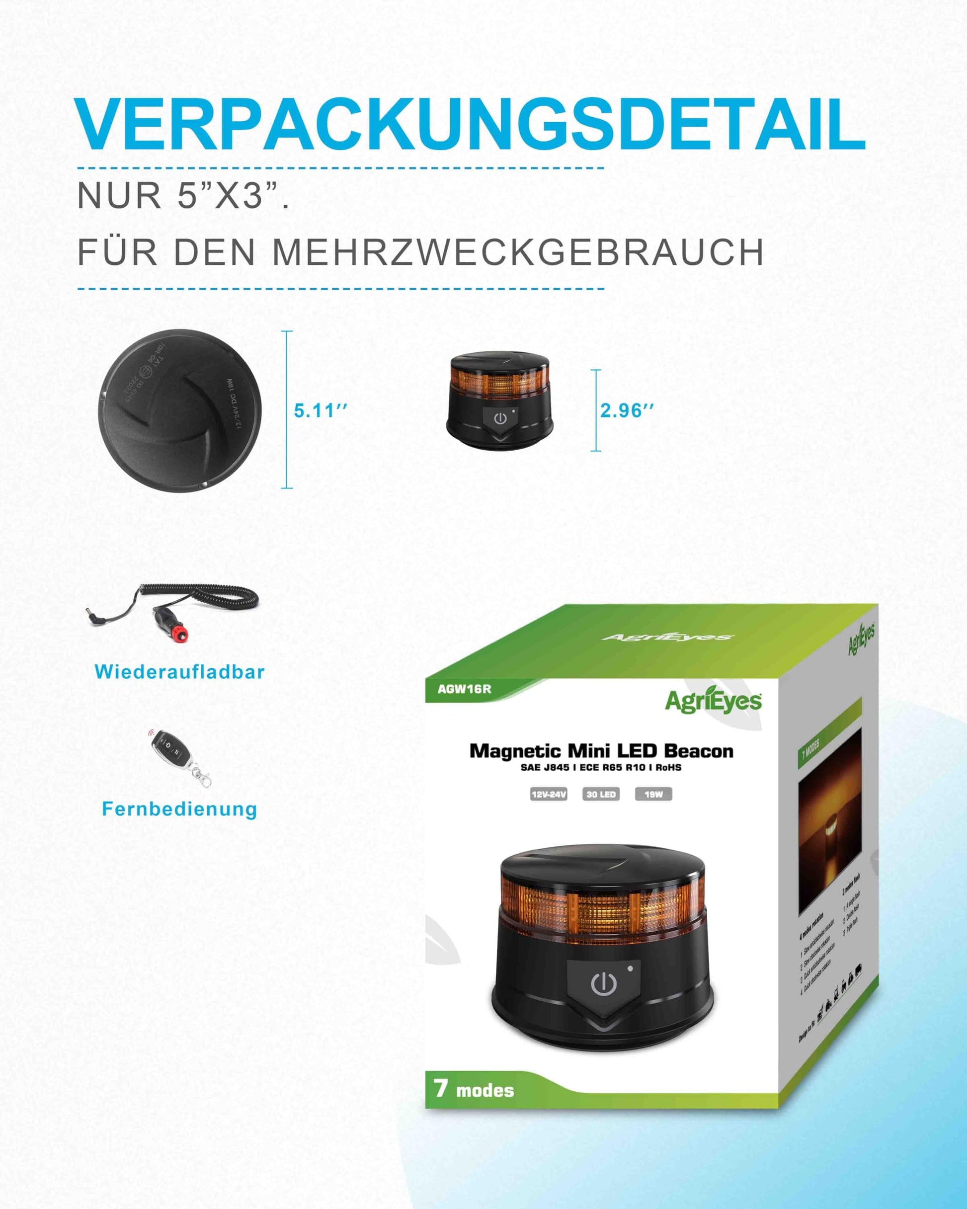 Agrieyes LED beacon light with remote control, 12V Yellow warning light car magnet with suction cup, LED battery warning light for tractor, Cordless beacon light for tractor vehicle truck