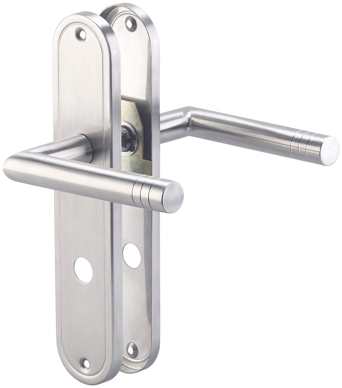 "The set includes 2 door handles including 2 long plate rosettes, bolt, square pin, mounting material and German instructions. Door fittings WC long plate - Also relevant or suitable for: door lock, toilet, lock"