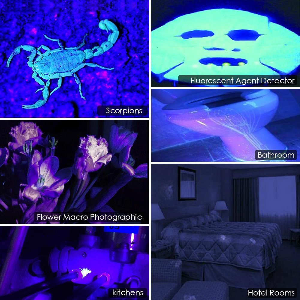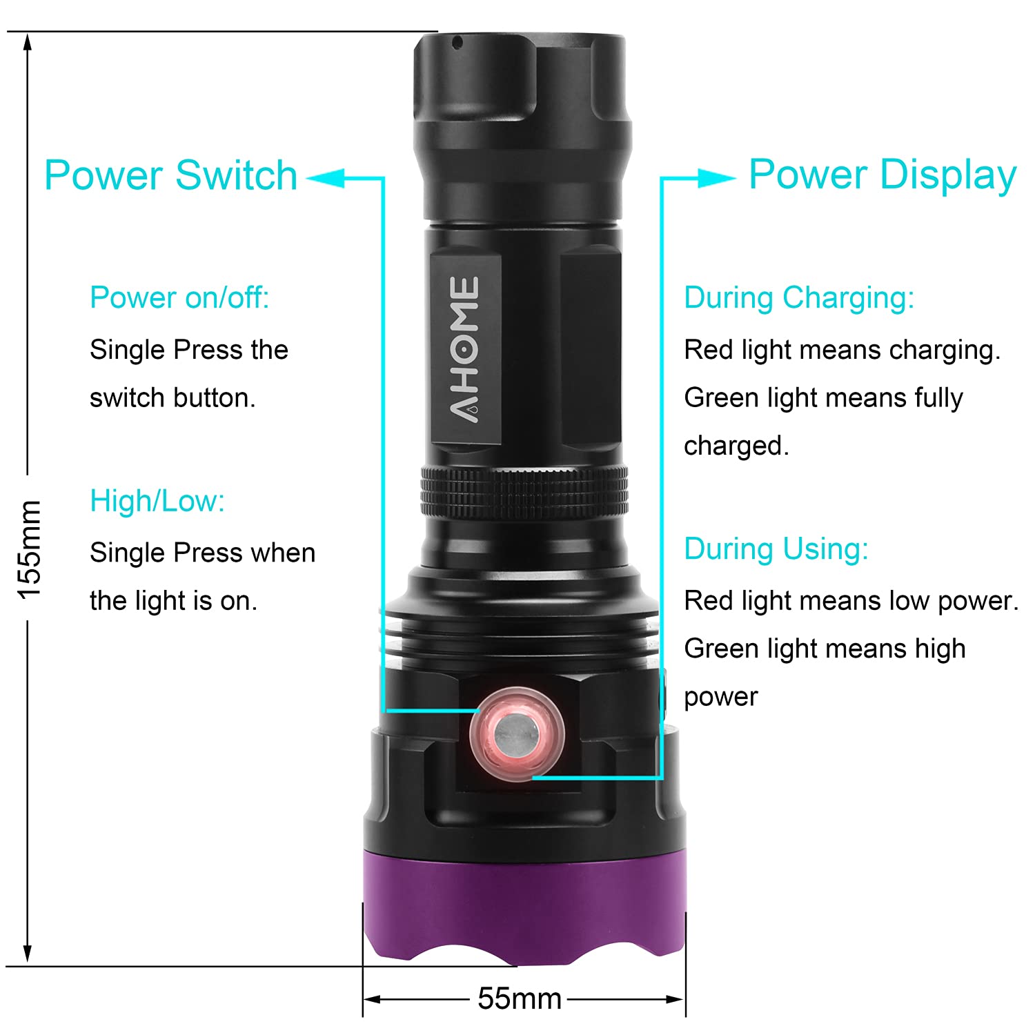 ["ULTRA POWER: Equipped with three large high-performance LEDs at 4.5 A, the Ahome flashlight shines with an intense beam that is brighter than those 100 LED UV lights: A leading challenge in the UV market!","USB CHARGING: With our advanced USB charging technology, charging can be made easier and more fun! The rechargeable 5000 mAh battery provides a long beam of light and saves a lot of money on batteries compared to non-rechargeable battery lamps","POWER INDICATOR: With an operating indicator next to the ON/OFF button, you can easily plan when to charge and use the device. Green light means high power and red light means low power. Use one hand to switch between two modes: High/Low","MULTIFUNCTION: Clearly detect dried urine and stains from dogs/cats/other small animals on carpets/clothes; Dry nail gel; Easily spot scorpions; Identify authentic/fake currency; Check hotel rooms for cleanliness such as human fluids, etc.; Detect repairs/cracks in antique porcelain/glassware. Detect leaks in vehicles and industrial fluids","TOUGH & DURABLE: The waterproof IPX5 standard ensures it shines even in heavy rain/snow, while the thick aluminum body makes the light extremely durable and abrasion-resistant"]