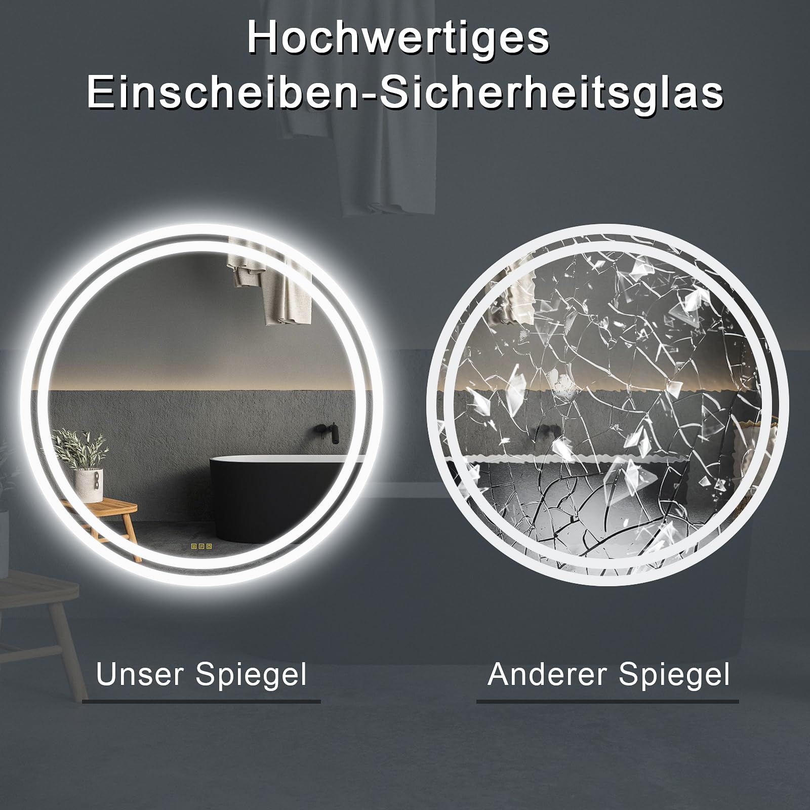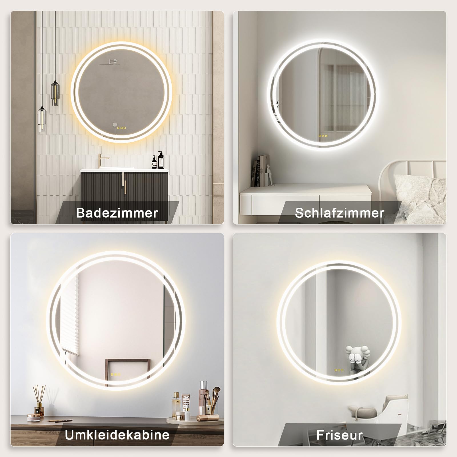 ["Good Quality: Our round bathroom mirror with lighting is made of high-quality tempered glass, which does not splash even when broken, and the edges are smooth and burr-free, making the use safer!","3 Light Colors: Touch the switch in the middle of the LED bathroom mirror, you can choose three color temperatures that meet your needs in different rooms.","Infinitely Dimmable: Long press the dimmer switch of the bathroom mirror with lighting, you can adjust the brightness between 10%-100%, even in a dark environment, it can be safe to use, illuminating your beautiful face!","Fog-free: Turn on the defogging switch before showering to effectively prevent the mirror from fogging up and ensure a clearer view","Memory Function: The bathroom mirror with lighting remembers the light settings, and when turned on next time, the brightness and color temperature will be the same as before turning off the mirror","Quality Service: If you encounter any problems during use, please contact us by email, we will respond within 24 hours, hoping to bring you a good shopping experience!"]