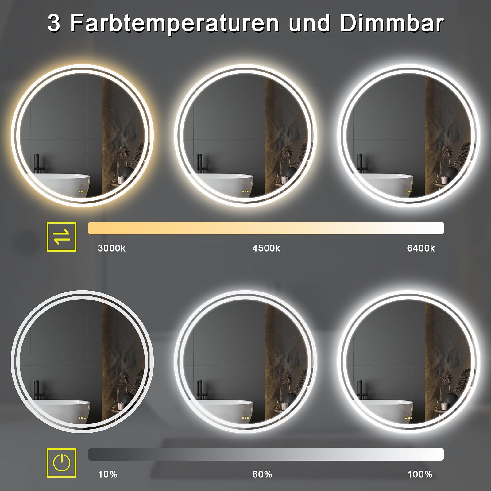 AI-LIGHTING LED bathroom mirror with lighting 50cm round illuminated mirror Anti-fog wall mirror with lighting with 3 light color dimmable 3000K/4500K/6400K