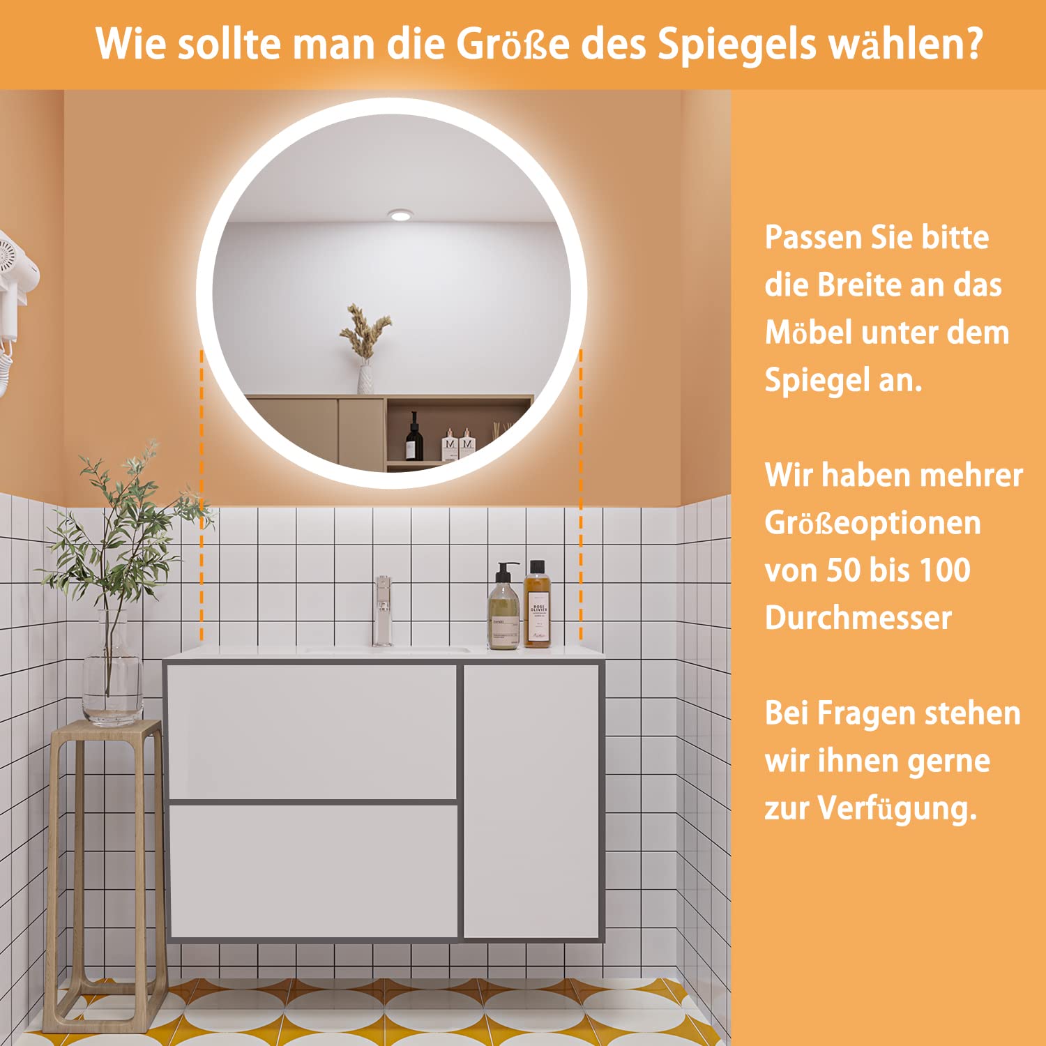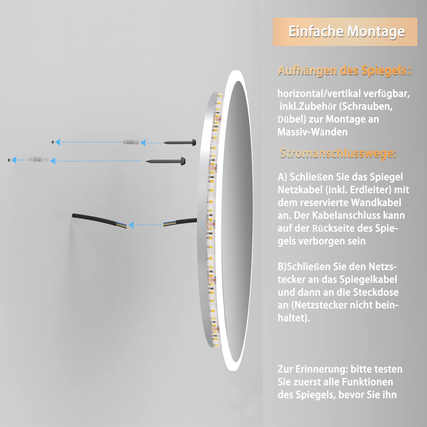 ["LED bathroom mirror Round has a diameter of 31.5 inches. The LED bathroom mirror is directly connected to the power supply. Mounting hardware and manual are included in the delivery.", "Touch switch: An illuminated touch button for Cold White LED lighting and anti-fog function. Note: The lighting is only for additional lighting and cannot be used as the main light in the bathroom.", "Anti-fog protection: The anti-fog function is automatically activated when the LED light is turned on. Do not worry about the steam affecting your view in the mirror.", "Environmental protection & safety: Copper- & lead-free mirror, energy-saving LED, LED lifespan of 50,000 hours, IP65 light strip with epoxy resin cover, grounding connectable, rust-resistant aluminum frame and waterproof back panel.", "Service: The mirror is a fragile product. If you receive any defects in the product, please send us an email in a timely manner, we will respond within 12 hours and offer you a satisfactory solution."]