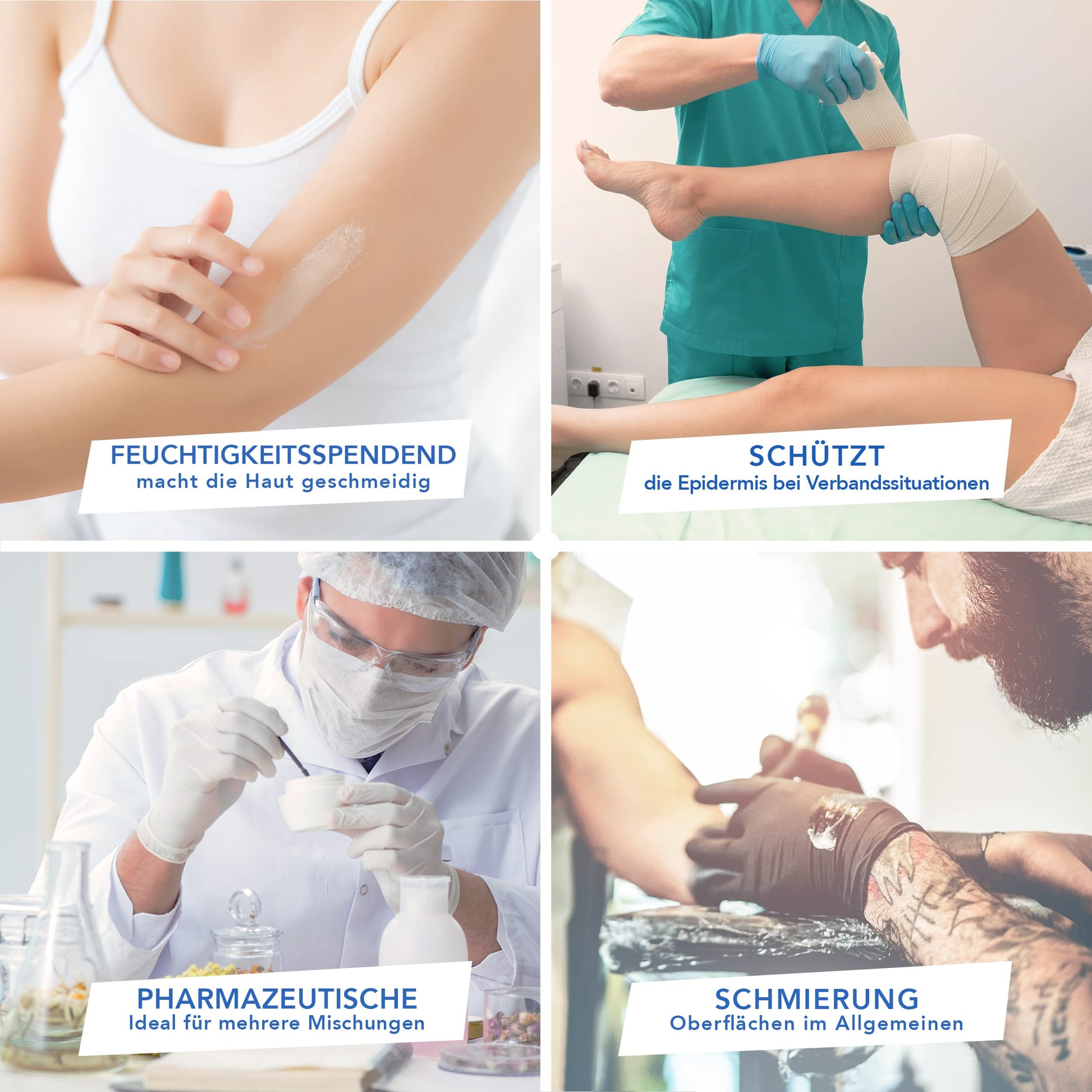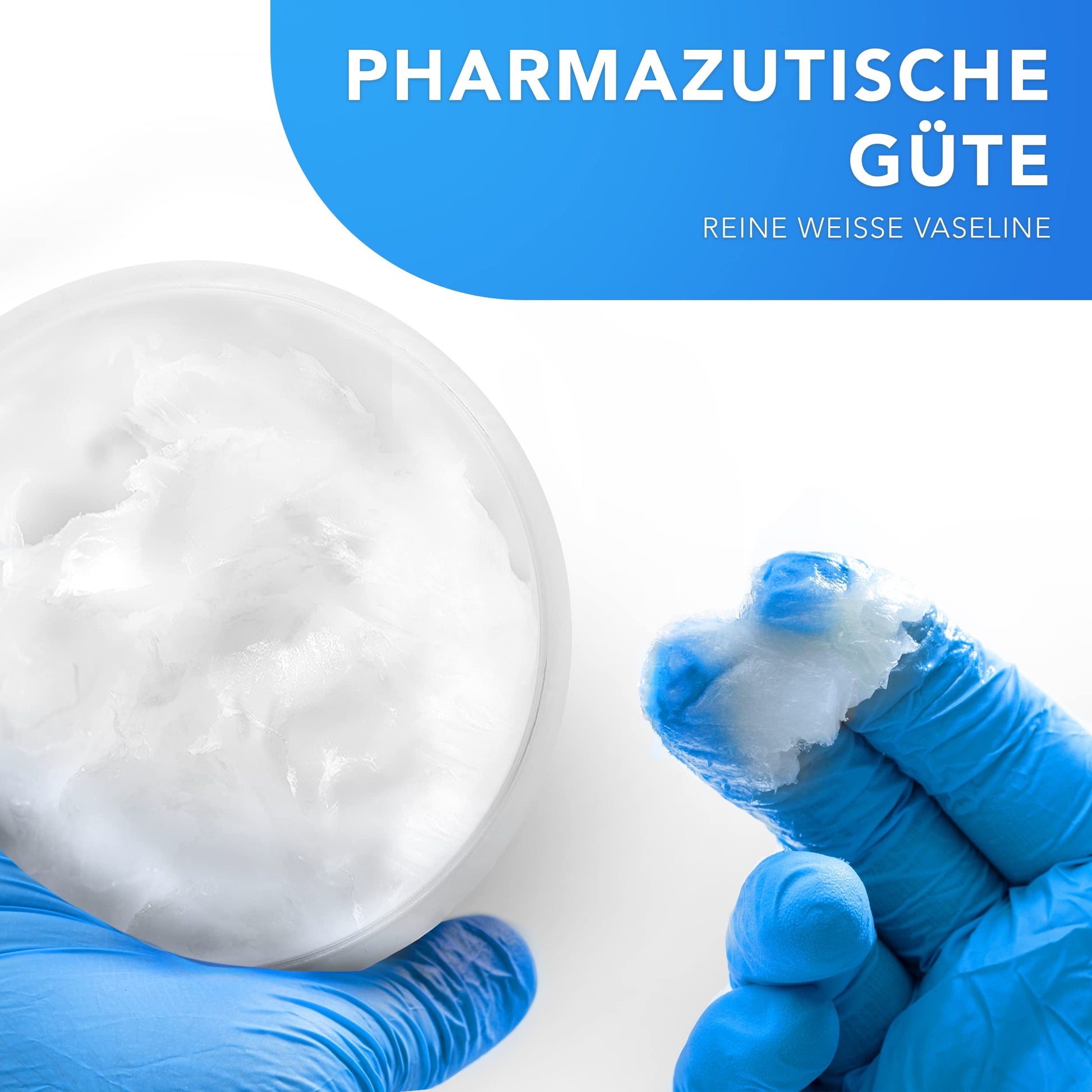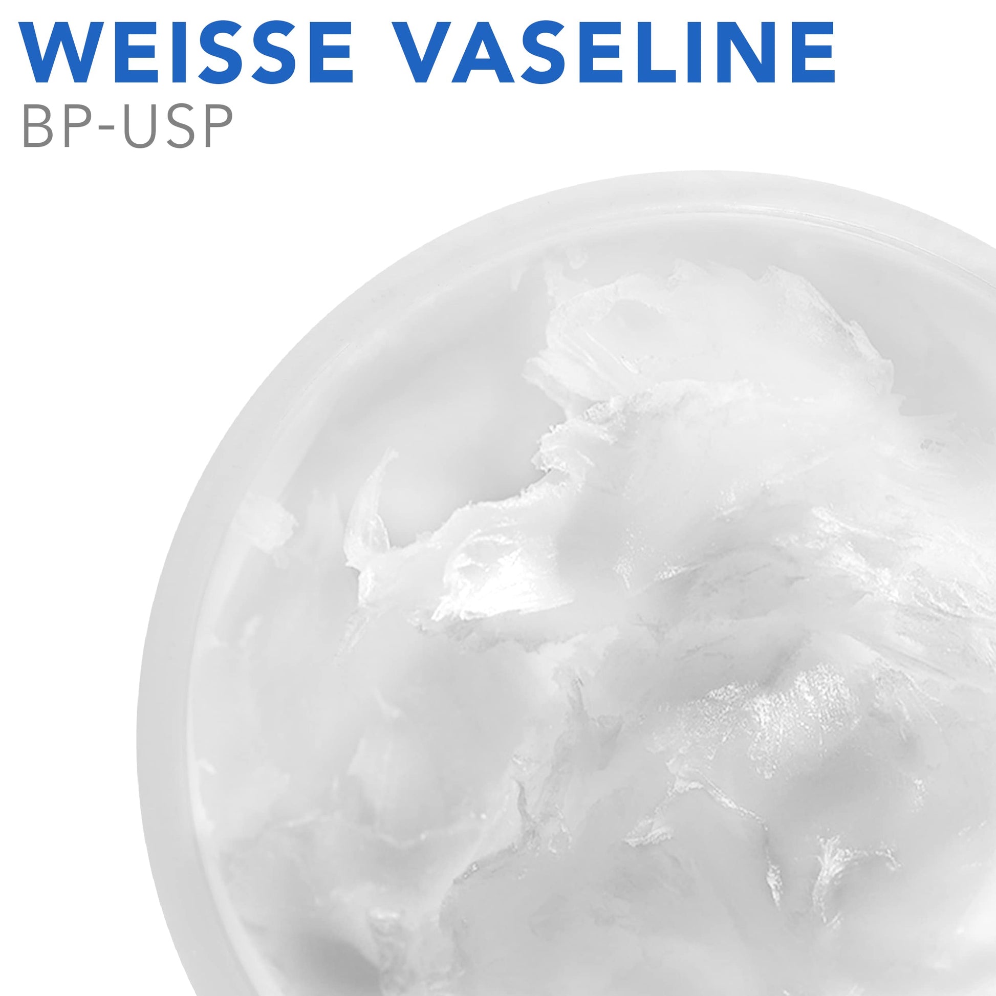 ["VASELINE white Ph.Eur. pure pharmaceutical quality is typically used as a base in many applications, including cosmetic, pharmaceutical, food, and industrial applications in general","MEDICAL USE: neutral emulsion of translucent white, non-stick coating in the pre-wrap phase and in bandages to protect the epidermis from any kind of friction with the fabric","DERMATOLOGICAL USE: moisturizing oily cream, makes the skin more elastic","IDEAL for tattoos and as a lubricant for general use","Product complies with the current provisions of the Official Pharmacopoeia - Made in Italy"]