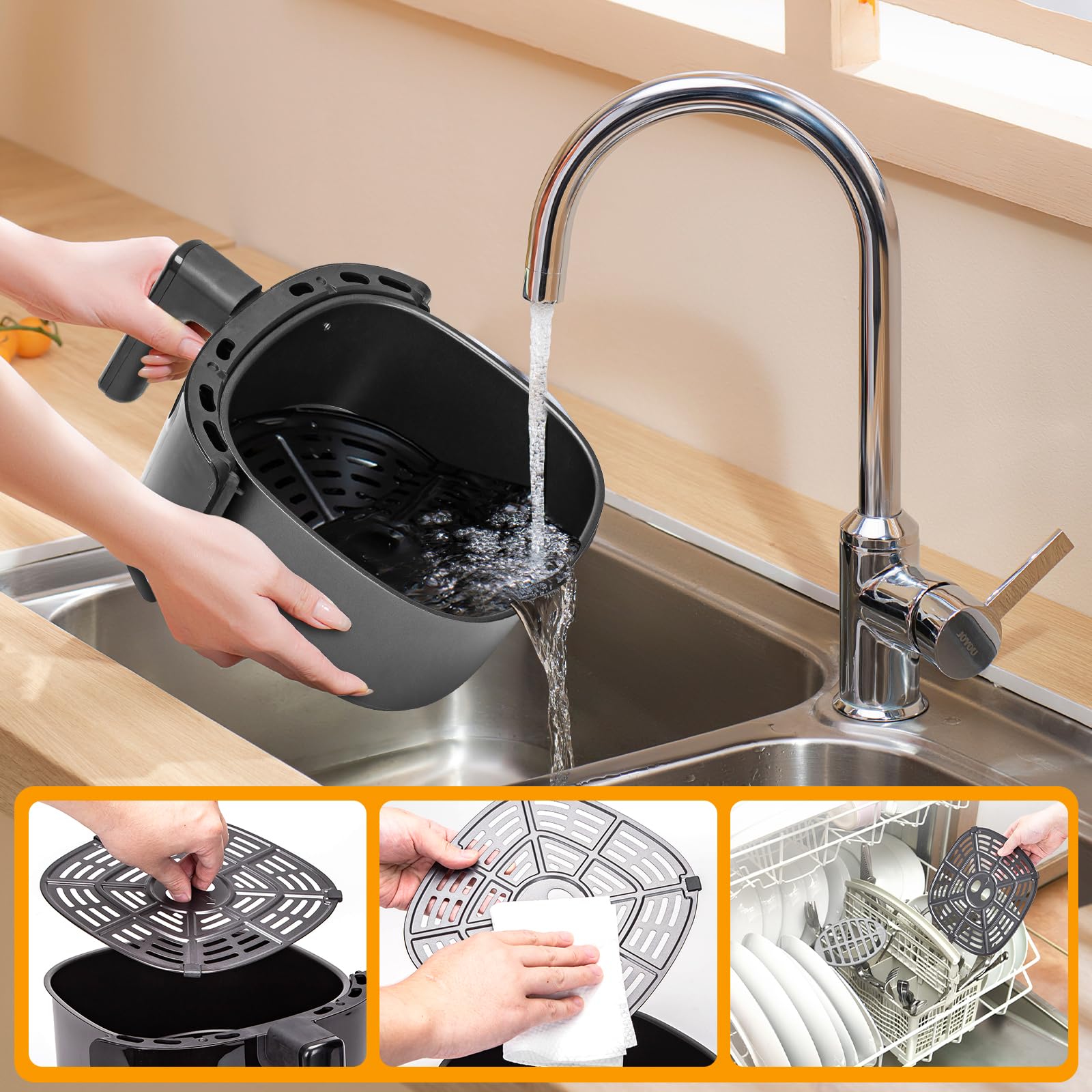 ["Modern LED touchscreen control: The air fryer features a user-friendly LED touchscreen display with 8 pre-set menu options. Easy operation for perfect results at temperatures from 40°C to 200°C and a timer setting of up to 60 minutes. Ideal for healthy, low-fat meals.", "360° hot air technology: The air fryer uses advanced convection technology to cook food evenly and crispy - without oil. Enjoy delicious, low-fat dishes with the 4L air fryer, which has a capacity of up to 4 liters.", "Convenient features: With the XXL air fryer, you can easily flip food thanks to the removable frying basket. The automatic shut-off when pulling out the basket ensures additional safety. The non-stick surface makes cleaning a breeze.", "Safety and convenience: The air fryer is equipped with non-slip feet, a cold-insulated handle, and overheating protection. The cord storage slot makes storage easy. Perfect for families who value healthy eating.", "Time-saving and versatile: The 1500W air fryer with preheating function saves time. Enjoy a variety of dishes - from crispy fries to juicy chicken - easily and quickly."]