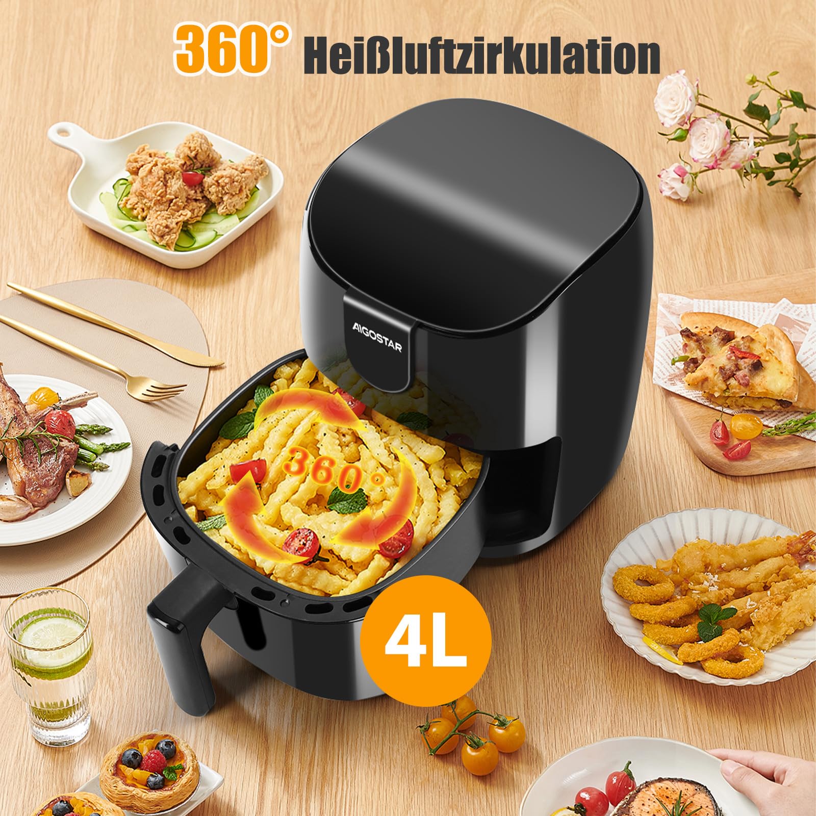 Aigostar Air Fryer 4L, large capacity hot air fryer, oil-free, 8 menu options, LED touchscreen, 1500W, BPA-free.