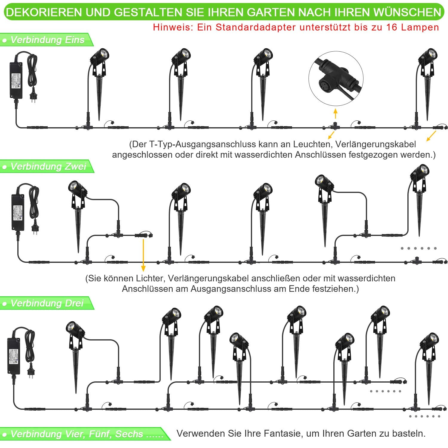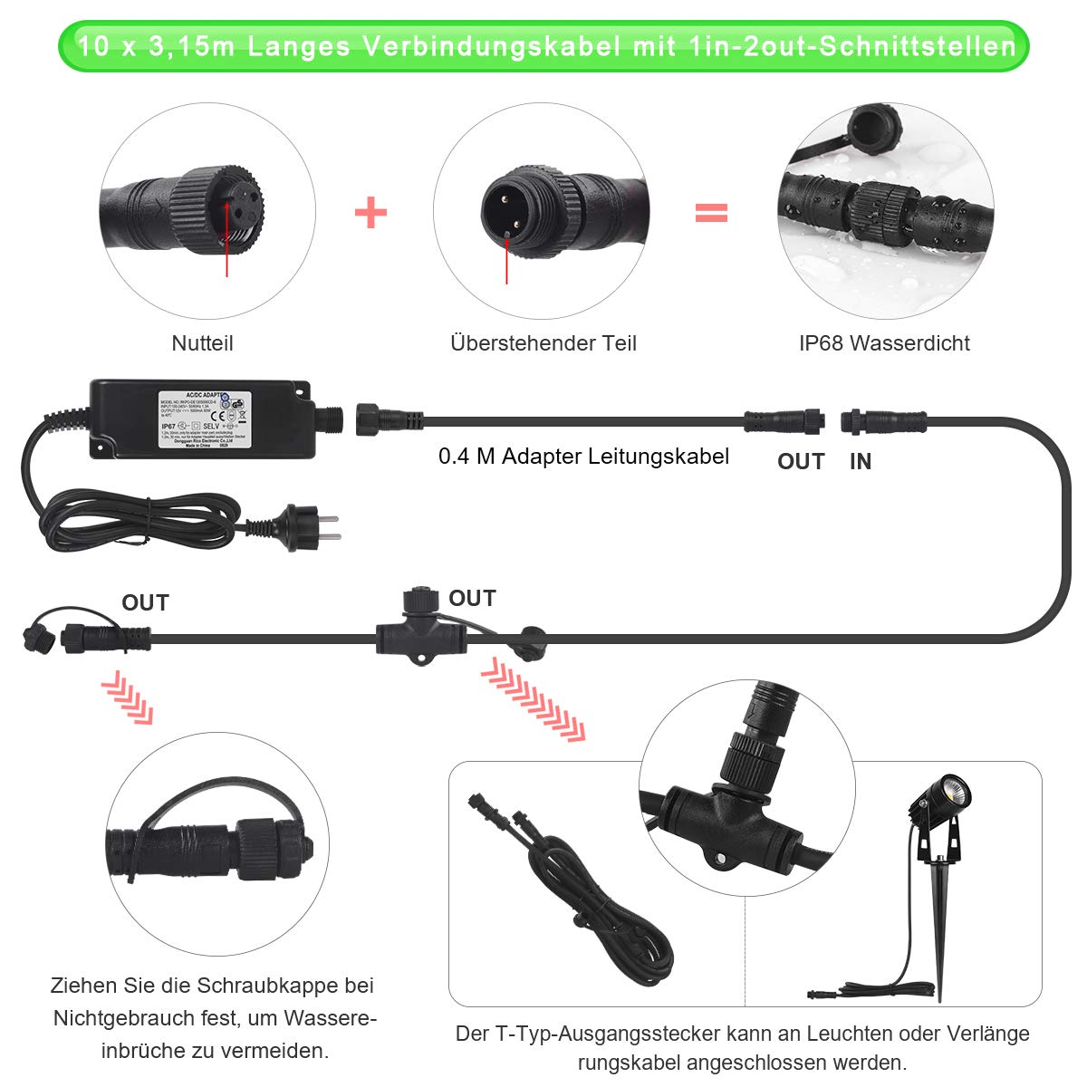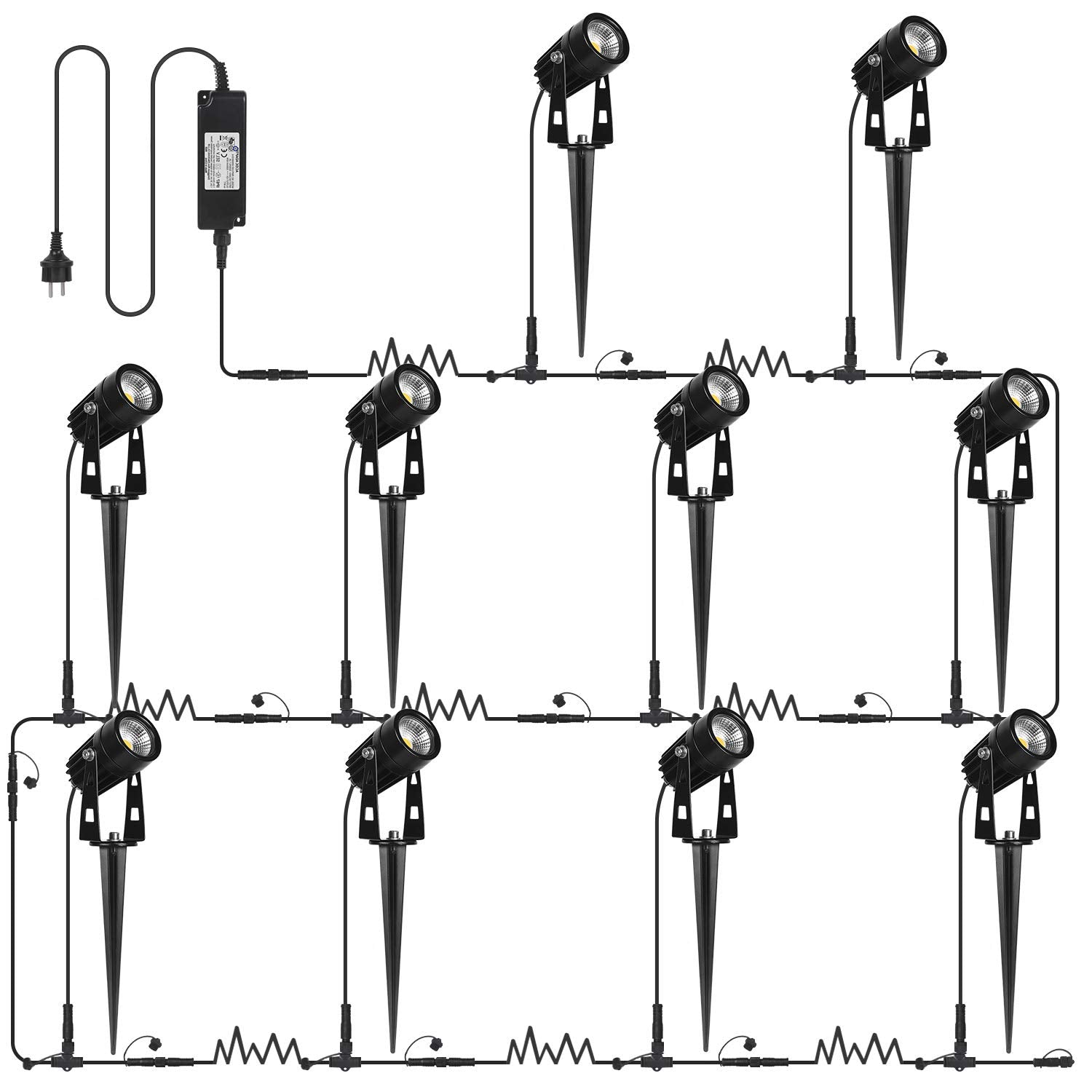 ["Super Bright 10-Piece Garden Light Set with Ground Spike. Update the COB LED chips, 375LM per spotlight, total 3750LM, more stable and brighter than standard LED chips. The warm white garden spotlight can provide enough light and a comfortable atmosphere for your patio, porch, path, deck, pool, yard, garden, garage, driveway, etc. Create.","Upgrade IP65 Waterproof Ground Spike Spotlight. Professional waterproof structure, the entire lamp is IP65 and all cables are IP68 waterproof. The screw cap on the cable connection makes the water completely inaccessible, allowing the garden lamp to withstand all weather conditions. But the plug is IP44, please keep the plug away from water.","DIY garden lighting with cable. Flexible design, three interfaces on each connecting cable that can be arranged as needed. Please refer to Figure 5 for details. The improved garden light has a 31.5m long connecting cable. The total length of the 10 garden spotlights can reach 31.9m when connected in a straight line.","Adjustable LED Ground Spike Outdoor Spotlight. 45° beam angle, the light head of the garden spotlight can be rotated horizontally or vertically by 360°, allowing for individual orientation. Upgraded advanced materials, perfect as a plant lamp, patio light, pathway light, and outdoor lighting for ponds and walls. (Note: If you need more cables, please visit our ASIN B08FBVKY7W and B08FBV44Z8).","High-quality garden spotlight with plug. 10 pieces of garden lights with a transformer. DC 12V low operating voltage, safe and reliable. Depending on the layout of your garden, the lights can be enlarged or reduced. One adapter can connect up to 16 lights. (Note: If you need more lights, please visit our ASIN B08FBT2TF3 and B08FBTWZ17)."]