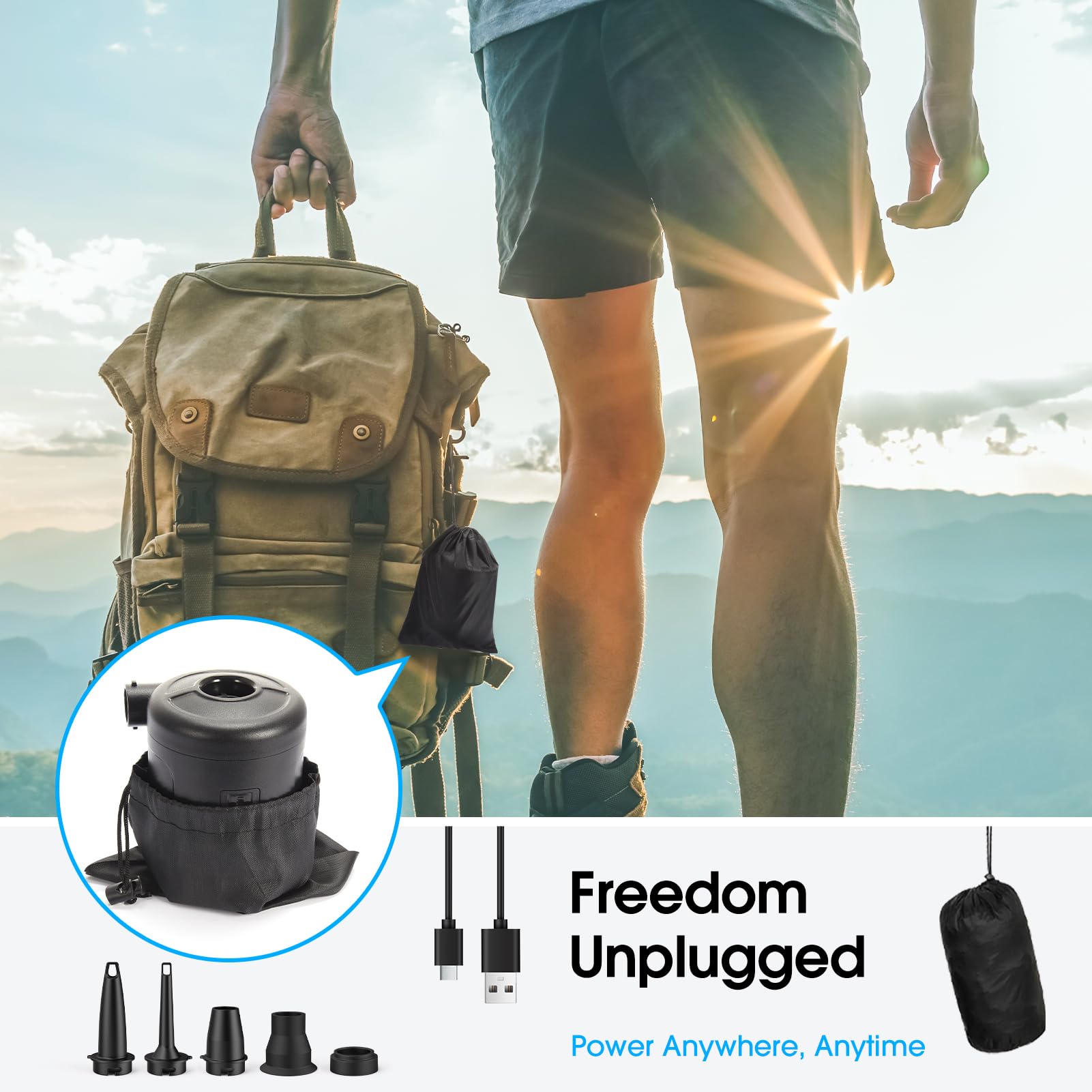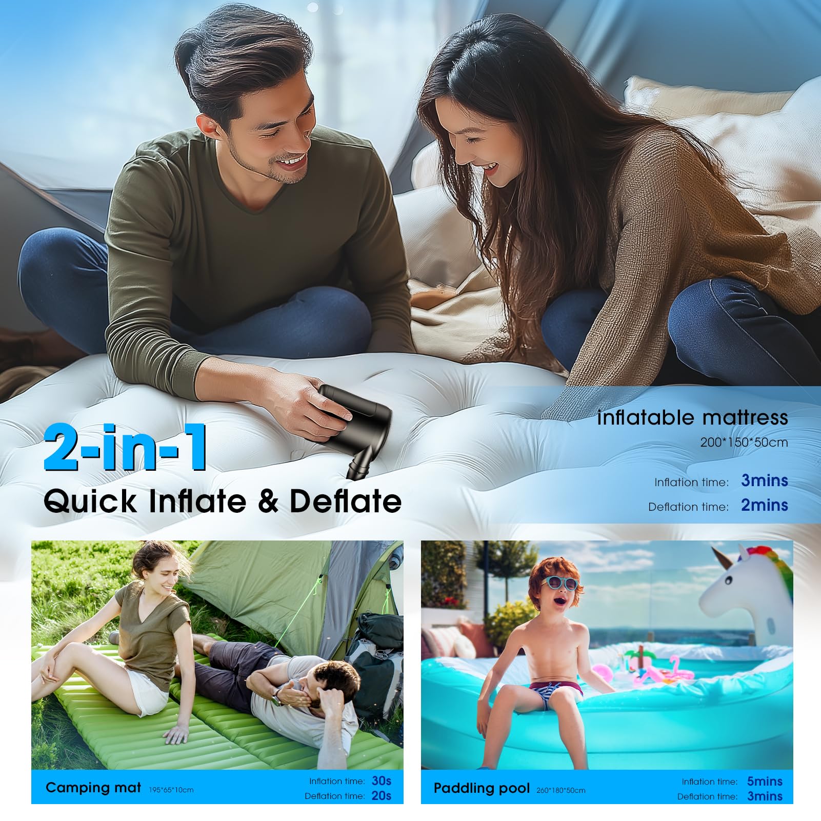 ["Fast & Powerful – 450L/min Airflow"] With 8000RPM turbo power, the pump inflates air mattresses, camping mats, paddling pools, pool items, or swim rings in seconds (depending on size). Simply connect the nozzle, press the button – done! Also, emptying is faster than with manual pumps. More time to enjoy!