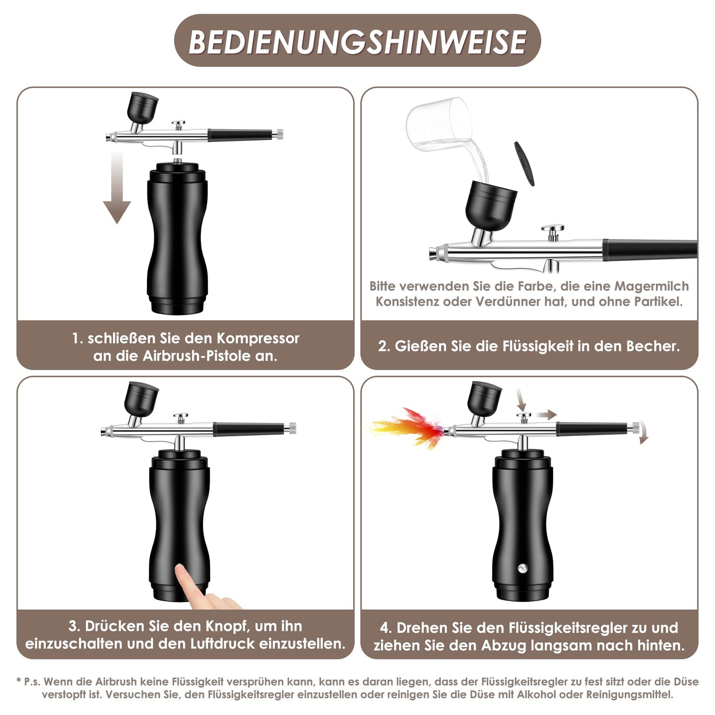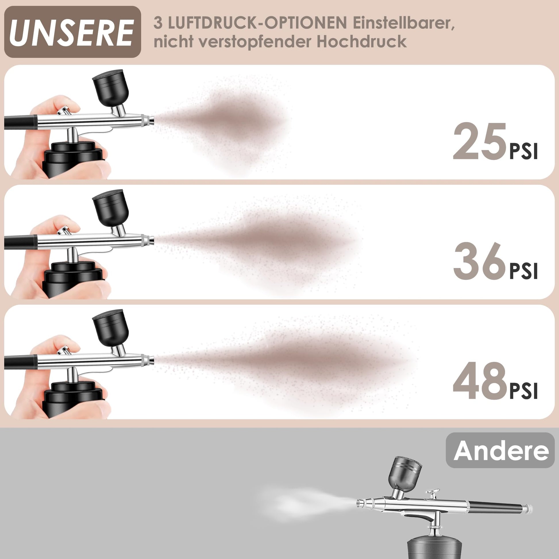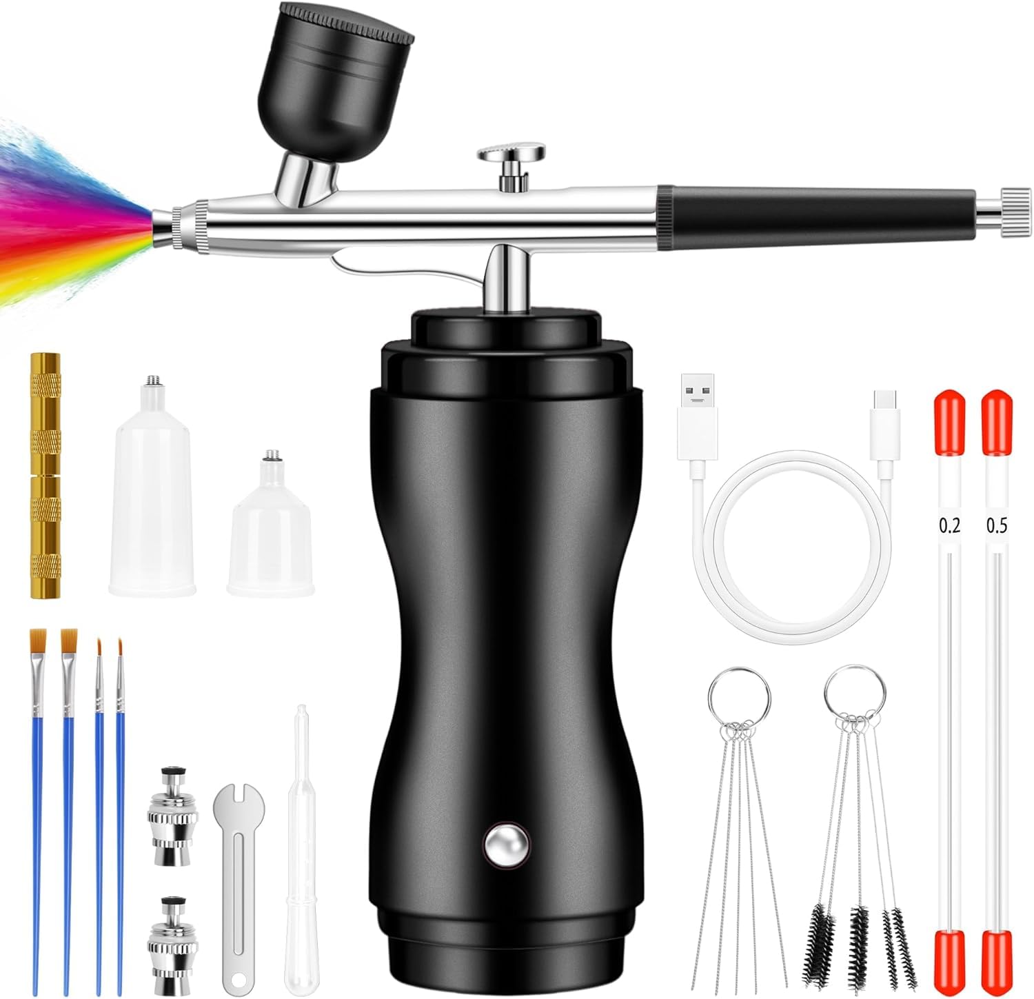 ["3 types of air pressure Our airbrush gun has 3 adjustable air pressures (25 PSI-36 PSI and 48 PSI). The lower pressure is 25 PSI, which is very suitable for airbrush gun makeup. The higher pressure is 48 PSI, our airbrush kit is suitable for art painting, cake decoration, nail art, crafts, model coloring, illustration, temporary tattoos, hobbies, and more.","Cordless and portable Airbrush is equipped with a Type C charging cable for charging, you can take it with you, please fully charge it before using the airbrush. The battery can work continuously for more than 60 minutes, supports USB and mobile charging","Different Fluid Nozzle This airbrush gun with a 0.2/0.3/0.5mm nozzle allows for finer control of paint flow and less overspray, you can screw the adjuster to control the spray amount, increasing your ability to produce fine work. The nozzle is removable, we provide additional nozzles in the package for replacement","All-Powerful Accessories Our airbrush compressor kit includes plenty of accessories, 1 x airbrush, 1 x dropper, 1 x 0.2mm interchangeable nozzles, 1 x 0.5mm interchangeable nozzles, 1 x wrench, 5 x spray gun cleaner, 5 x wash needles, 4 x paint brush, 1x 0. 2mm needle, 1x 0.5mm needle, 2 x plastic cups (20CC and 40CC), 1 x Type-C charging cable, 1 x user manual","Better After Sales Service When you receive the product, please check if the goods are intact. If you have any problems like airbrush clogging, paint splattering, compressor not working, etc. Our 24-hour email consultation service is here to give you peace of mind to use the airbrush"]