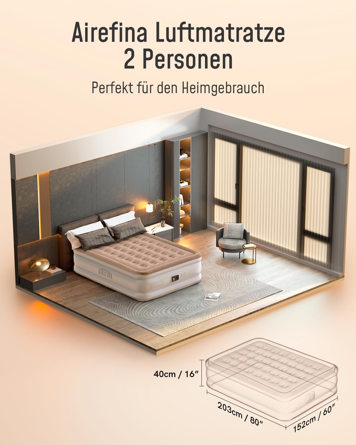 Airefina self-inflating air mattress with integrated pump, premium guest bed, fast inflation in 3 minutes, inflatable mattress for camping home use - 203 x 152 x 40 cm.