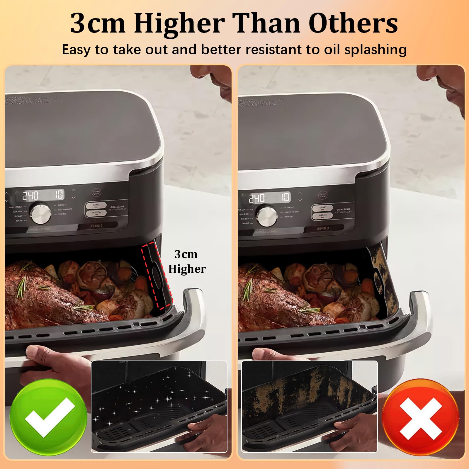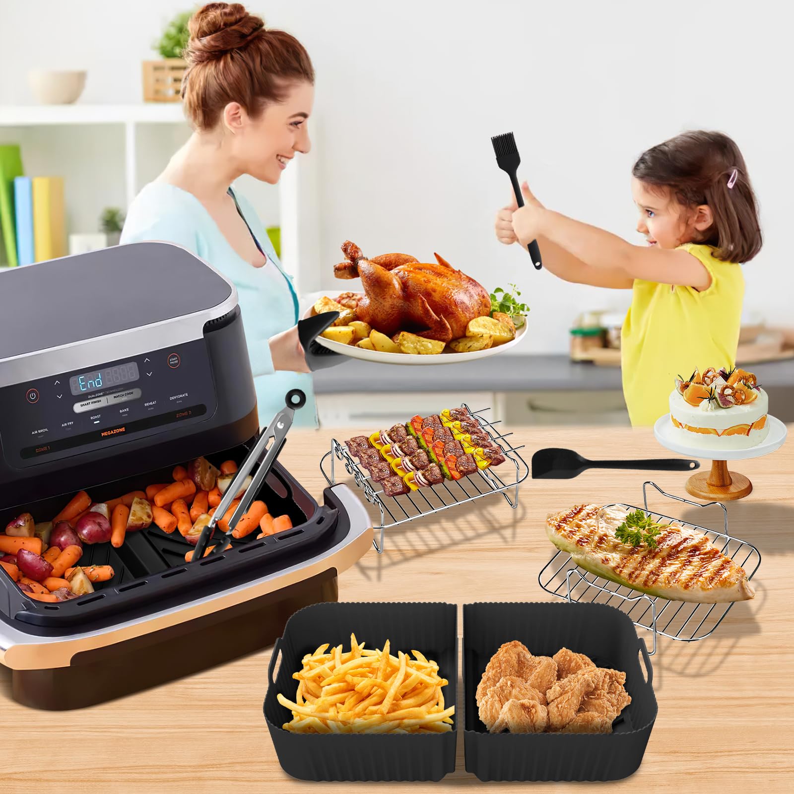["Higher and larger silicone air fryer inserts - Our air fryer silicone inserts are specifically designed for Ninja Foodi Flexdrawer Dual Air Fryer 10.4L AF500EU, AF500EUCP, 3 cm higher than others, easy to remove and more resistant to oil splatters. Larger size, larger capacity.", "14-piece air fryer accessories - The air fryer accessories include 1 x 10.4L silicone air fryer inserts, 2 x 5.2L silicone inserts, 1 x stainless steel steam grill, 1 x stainless steel grill rack, 4 x stainless steel skewers, 1 x oil brush, 1 * scald-proof clip, 2 * silicon gloves, and 1 * silicon spatula. Save time and effort in preparing kebabs, steaks, vegetables, potatoes, pizza, grill pasties, and more.", "Versatile and practical - 1 x 10.4L and 2 x 5.2L silicone inserts for air fryers, perfect for cooking different dishes separately. The double-layer rack provides even air circulation and uniform cooking of the food, saving time. The kebab stand comes with 4 skewers on which you can place vegetables and skewers. The oil brush helps you apply grill seasonings.", "Food-grade material - Our air fryer inserts are made of food-grade silicone, non-stick, BPA-free, and heat resistant up to 240°C. The air fryer stand is made of high-quality food-grade 304 stainless steel, safe, durable, rust-resistant. Gloves, oil brush, clamping mouth, and spatula are also made of food-grade silicone, so we can enjoy healthy food worry-free.", "Easy to clean - The inside of the silicone lining is treated with a special process that is easier to clean. It is also dishwasher safe, saving you time and effort after cooking. The air fryer stand is dishwasher safe, rust-resistant, and easy to clean. Wait for them to dry after washing and you can use them with peace of mind. We offer attentive 24-hour service. If you have any questions, please contact us."]