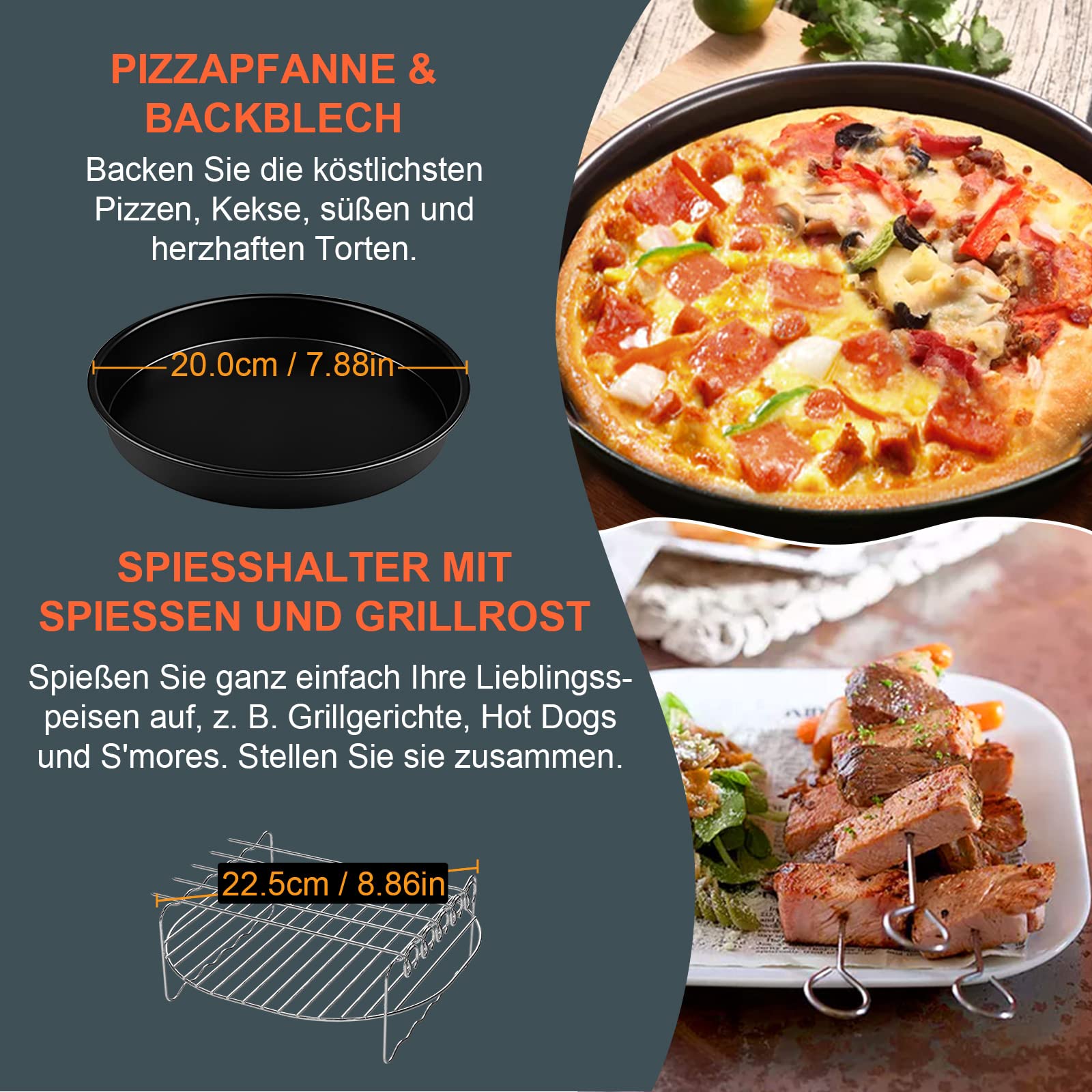 ["Food-grade Material & BPA-free & Non-stick Coating】Made of food-grade material, the BISNIE air fryer accessories are BPA-free, absolutely safe and healthy. Don't worry about dangerous chemicals anymore and enjoy your healthy cooking time. The pizza pan and cake barrel feature a heat-resistant coating that is non-sticky and durable.","【The BISNIE Fryer Accessories are Perfect for COSORI 5.5L, Philips 6.2L, Innsky 5.5L, KLAMER 5.5L Air Fryer】Note: XL and XXL are not the official size of the air fryer, please choose the appropriate accessories for your air fryer based on COSORI 5.5L, Philips 6.2L, Innsky 5.5L, KLAMER 5.5L. If your air fryer is a model from a different brand, please measure your fryer carefully before purchasing to ensure my accessories fit your fryer.","【Square Cake Barrel with Non-stick Coating & Pizza Pan with Non-stick Coating】The BISNIE cake mold is perfect for a variety of delicious foods like casseroles, cakes, bread, quiches, etc. The pizza pan provides the perfect surface for baking pizza, pies, pancakes, cookies, and more. Both are equipped with a stick-resistant coating, please do not scrub with a rough cloth or metal ball to protect the coating.","【Double Layer Multi-purpose Rack with Skewer & 50 Pieces of Air Fryer Parchment Paper】The double-layer rack maximizes the heating area of food and meets the higher demand, cook skewers on the top layer and cook onion rings on the grate layer. With a 4.5 cm high edge, the airfryer parchment paper can effectively protect your air fryer from grease and food residue, extend the life of the air fryer, and reduce cleaning time.","【Dishwasher Safe (except air fryer parchment paper) & Silicone Mat and Extended Food Tong & Pleasant Experience】Our air fryer xxl accessories include square cake barrel, pizza pan, double layer rack with skewer, 50 pieces of air fryer parchment paper, silicone mat, and extended food tong, dishwasher safe except for the parchment paper. We also highly value customer experience and will always be there for you 24/7."]
