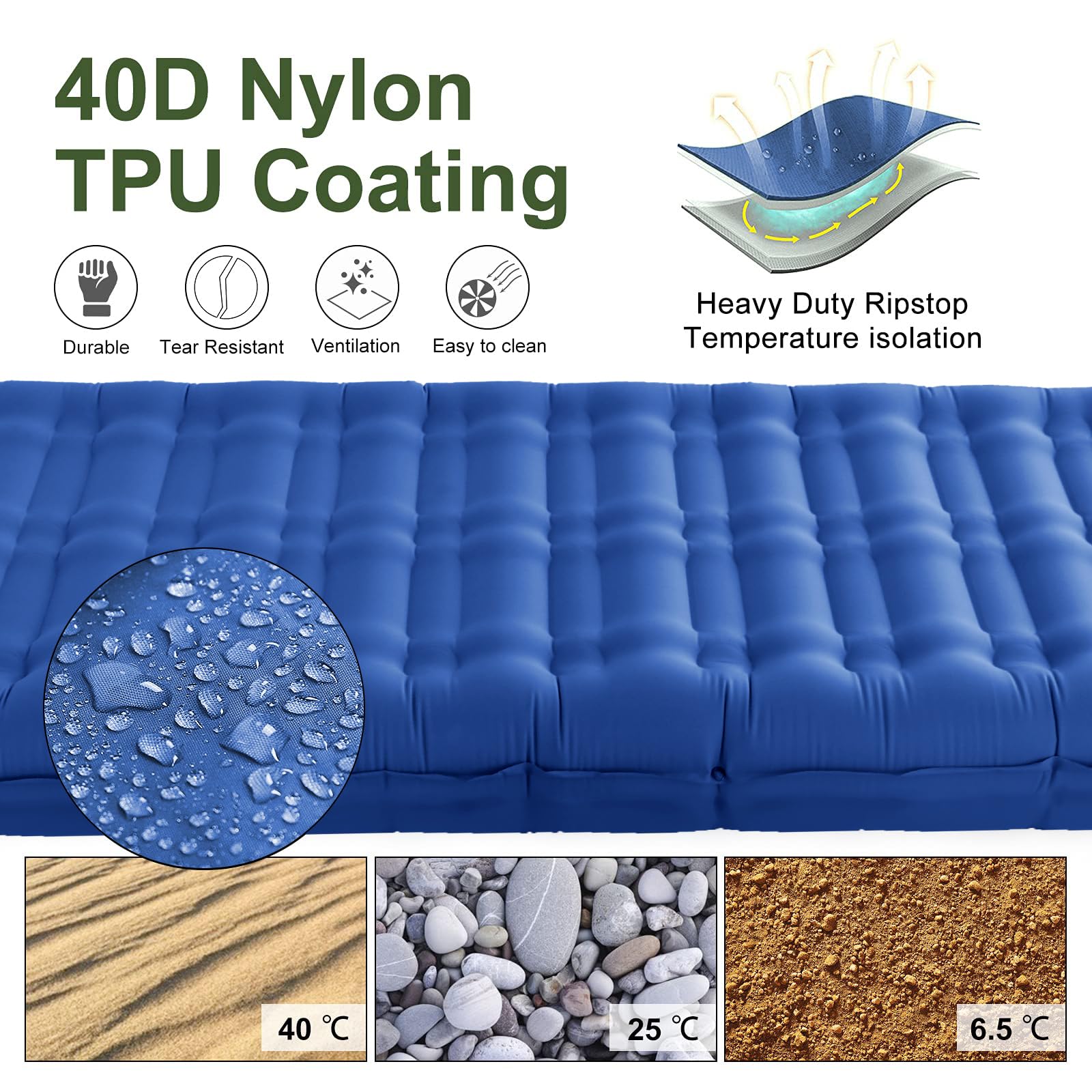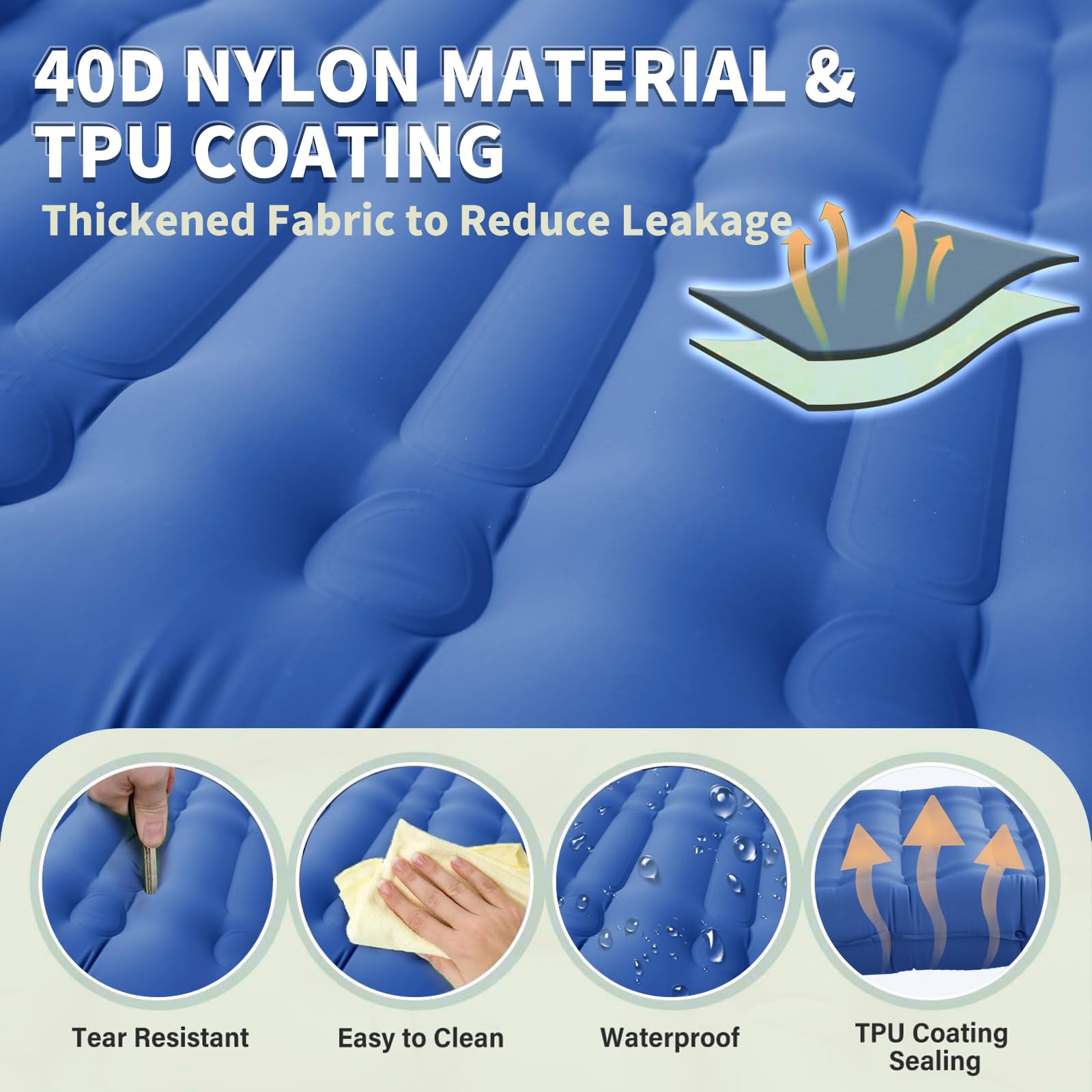 "Durable & Waterproof: Our self-inflating camping mat is made of sturdy 40D nylon with a waterproof TPU layer. The material is extremely pressure-resistant, tear-resistant, and durable. Thanks to heat-sealed edges, you don't have to worry about air leaks or tears - perfect for any outdoor adventure.
